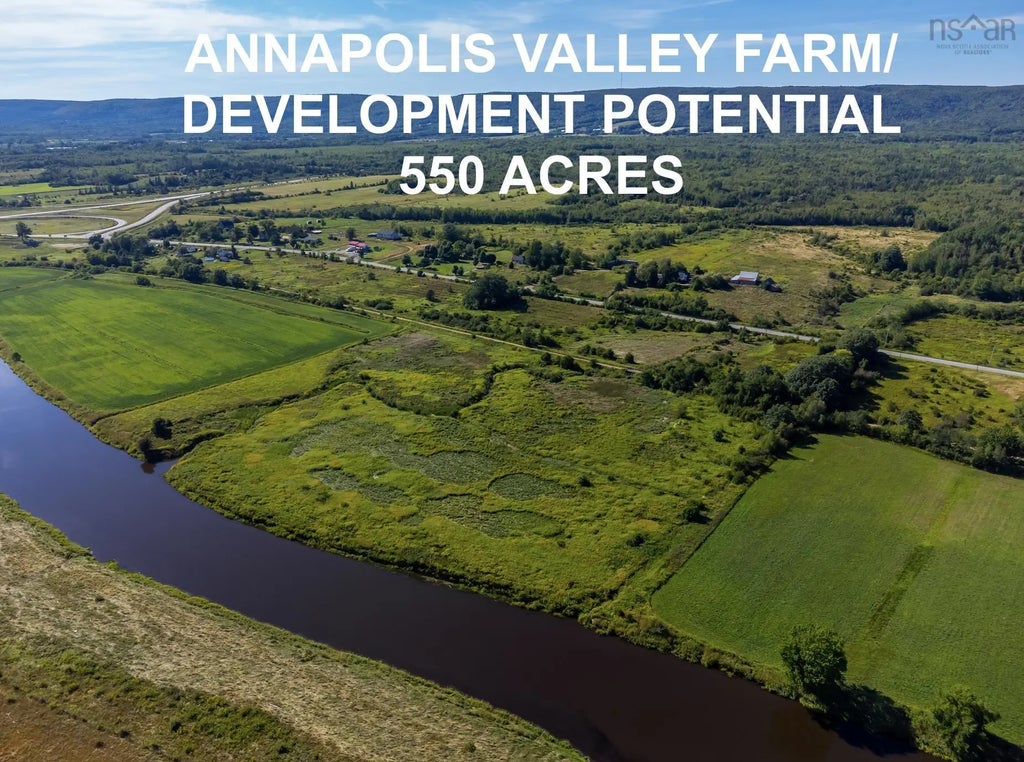 Prime development opportunity on 550 +/- acres in the Annapolis Valley. A mixture of farmland and woodland borders both sides of Hwy 1 and runs north across Hwy 101, just east of Bridgetown. A total of 23 PID's (land parcels) comprise the total acreage, with Annapolis River frontage as well, two former rail beds and the old Saunders Road providing so many potential opportunities to develop and or farm! There is an old existing farmhouse, barns and other outbuildings that could be repaired and put to use. If you are looking for development, look no further and own a large portion of this Annapolis Valley. Property is being sold 'as is'.