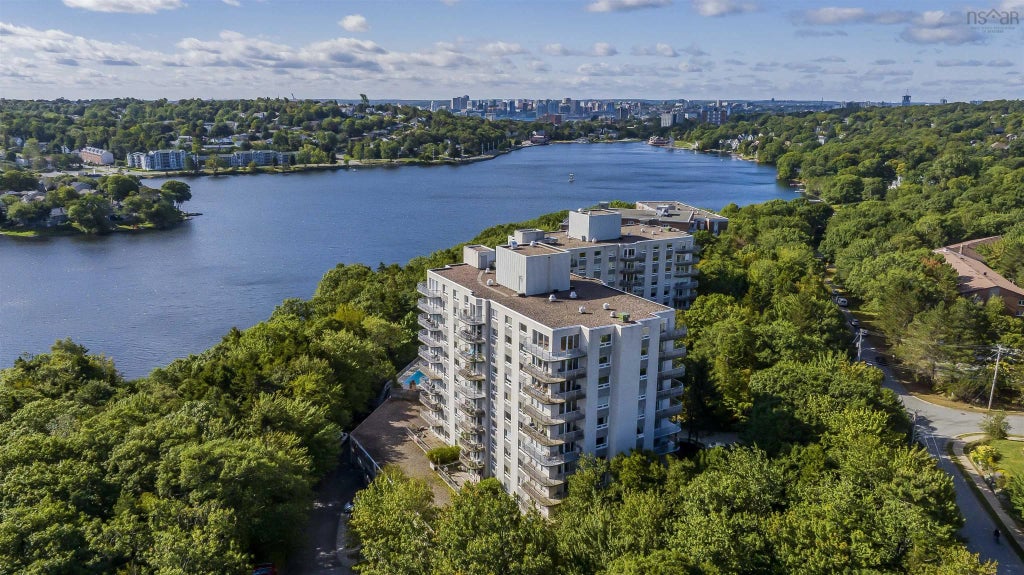 Sought after corner unit complete with wrap around deck and spectacular panoramic views of both Lake Banook and Lake Micmac. Lake Banook Woods offers prestigious condo living with a prime lakeside location close to downtown Dartmouth!! This 2 bedroom 2 bathroom condo offers a redesigned open concept kitchen with stained birch cabinets and island overlooking the spacious living area with large windows giving off lots of natural light. The generous primary bedroom offers a walk-in closet and renovated ensuite bath with custom tiled shower. Second bedroom, in-suite laundry and another full bathroom complete this fantastic condo layout. The building features a beautiful outdoor pool area, professional landscaping, gym, storage lockers and underground parking!! Outdoor enthusiasts will be right at home with Shubie Park and Trans Canada trail just outside your door while still being close enough to enjoy all that downtown Dartmouth has to offer with award winning restaurants, craft breweries, farmers market and more. Book your showing today!!