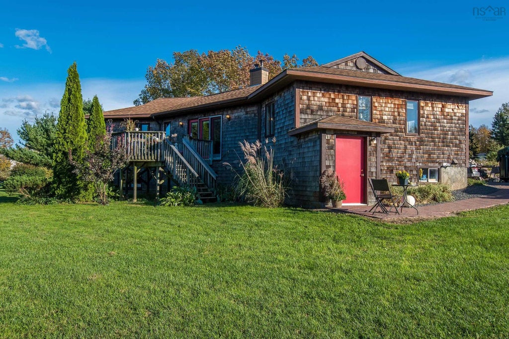 Located on the outskirts of the Town of Wolfville in the heart of wine country. Take in the trendy shops and restaurants of this sought-after area but benefit from a quiet rural living with an almost an acre sized, tree lined lot. Distant views of Blomidon. Within walking distance to Acadia University and downtown Wolfville. A2 zoning. Drilled well. Lot has frog pond at the back along with flowering shrubs and perennials. Paver stone patio and walkway, along with covered back decks and two sheds round out the exterior features.Inside, there is lots of natural light, and open concept living room, dining room and newly renovated kitchen. One level living with 3 bedrooms and 2 baths and laundry on the main floor. Gorgeous new walnut flooring by Roysons Flooring in main living area. Cozy wood stove in living room supplements electric baseboard heat. 4th bedroom and 3-piece bath on lower level. Basement has walkout, with large rec room. Plus, large unfinished storage and workshop area has potential to finish this space into in-law suite. Washer and dryer hook ups in place in basement as well. Under an hour commute to Halifax and half hour to 14 Wing Greenwood.