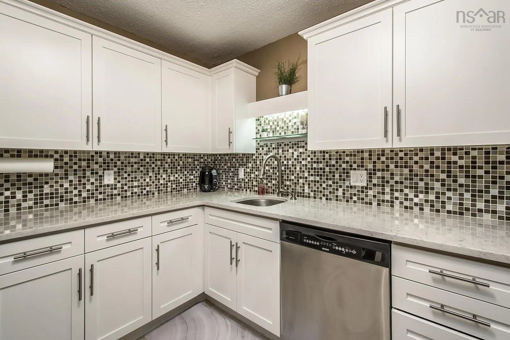 Welcome to this beautifully updated 2 br 1.5 bath condo on popular John Parr Drive. This unit has a gorgeous updated kitchen with quartz countertops and modern stainless steel appliances. All new quality laminate flooring in the main living area, stylish cork flooring in the bedrooms and ceramic in the kitchen and baths. Both bathrooms have contemporary subway tile and new vanities and countertops as well as a renewed bath surround. The wood burning fireplace has a lovely stone facade and wood mantle and most rooms are freshly painted. There’s also a family sized stacked washer and dryer and an in unit storage room with a brand new water heater. This ground floor condo backs onto the highway and has a nice private patio with walkout to the grass. The building is pet friendly with a dedicated dog run. Condo fees include an assigned parking space, fireplace and exterior maintenance and snow removal. This is the one to see!