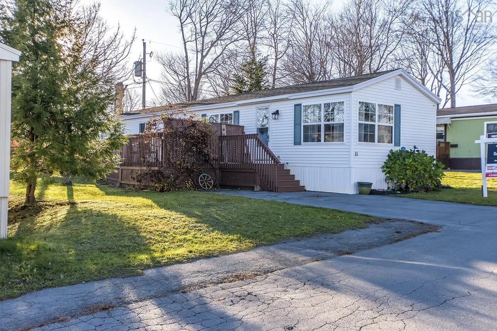Move in ready this two bedroom one bath mini home is situated in popular Timber Trails Park, friendly neighbours, and very well kept park. Boasting 1045 square feet of living space, large 208 sf deck and level lot. The kitchen features a center island, an abundance of cabinetry and counter space, dining area, built in wall oven and cooktop. The spacious living room with hardwood flooring offers built in shelving and a propane fireplace to provide a cozy atmosphere. The primary suite is huge and offers a full wall of closet space and tile flooring. The second bedroom is located off the living room with double garden doors and tiled flooring. The beyond spacious 3 pc bath features a large walk in shower with seats (no tub). The laundry is tucked away in a large closet across from the patio doors leading to the large private deck. Two sheds included as well! If you are or aspire to be a dog owner there is a private off leash dog park close by. All amenities are within 10 minutes either to Sackville, Kingswood shopping area or Tantallon. Upgrades include HWT 3 yrs, roof 10 yrs, new doors 2020, programmable thermostats. Be sure to view the Matterport Virtual Tour!