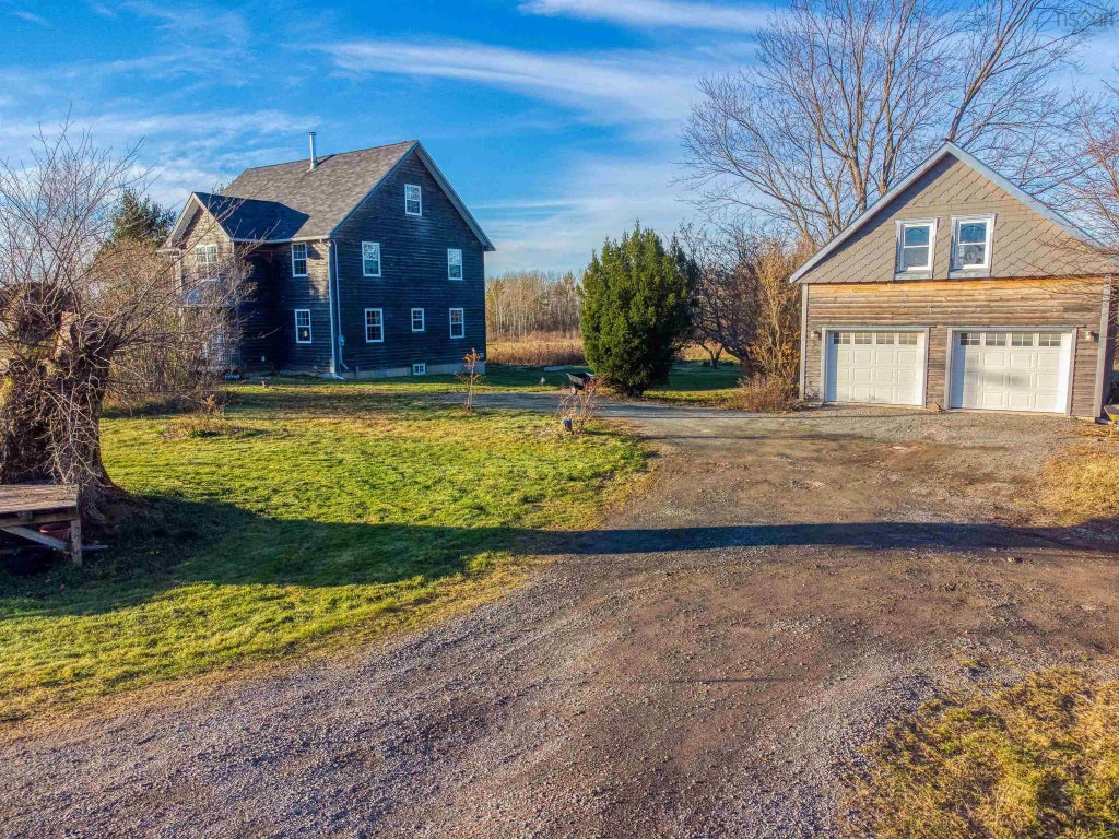 Welcome Home! As soon as you enter the main foyer, you will be greeted with the feel of an old farm house. Timber frame home built in 2011, just outside the Town of Wolfville, on the Ridge Rd. 4 bedrooms, 2 baths, wired detached 1 1/2 storey 2 car garage (24 x 24, built in 2017), 20 x 40 concrete pad for another garage or other use, situated on 4.62 level acres. Growing on the property - cherry, peach, plum, & apple trees, raspberry & blackberry. Main level consists of open concept living / dining / kitchen area, pantry, den/office, 3-piece bath (shower), large breakfast counter and a brick encased woodstove with separate pizza oven. 2nd level - 4 large bedrooms, 4 piece bath (separate shower and tub). Wide plank pine and porcelain flooring throughout. Art Deco light fixtures. Efficiently heated with electric baseboard and wood (about 3 cords of wood, average NS power bill $ 90/mo). Full basement, insulated and gyproced, ready for you to finish. Chemical-Free built home. No plywood or stryofoam. Composite free construction. No chemicals. No glue. No off gas. Appliances included: Fridge, CT Propane Stove, B/I Oven, Dishwasher, Washer & Dryer & Deep Freezer. 9 Chickens (or 5 if mom decides to take 4).