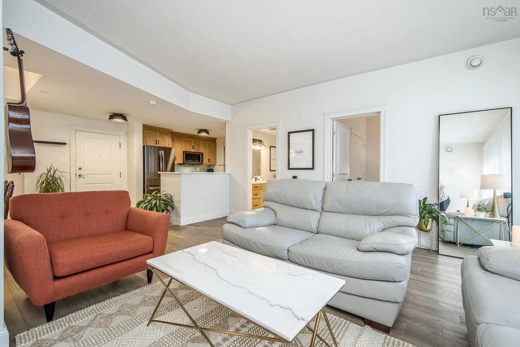 Beautiful 2 bedroom 2 Bath condo centrally located in Halifax! Open concept kitchen, dining and living room with patio doors to a full length of the condo patio for ample room to entertain! One bedroom and bath at one end of the condo with the Primary suite positioned privately at the opposite end. The primary bedroom has a large walk-in closet and a show stopping 4 pc ensuite that has been tastefully upgraded with modern brass fixtures, quartz counters, new porcelain tiled flooring and brass framed mirrors! The condo has been recently painted throughout, beautiful engineered hickory hardwood floors and new mosaic tiles in entry, kitchen, and second upgraded bathroom! More features include all new modern high end light fixtures, tray ceiling, and new LG kitchen appliances! With affordable condo fees, comfortable Geo-themal heating/AC, underground assigned parking and storage you can't go wrong! Condo faces Long Lake area and easy access to walking/biking trails and all amenities! Building has a private gym and a larger one available for minimal fee, common room if you are hosting a larger gathering and second outdoor parking space available for small fee as well. Call soon to view!!
