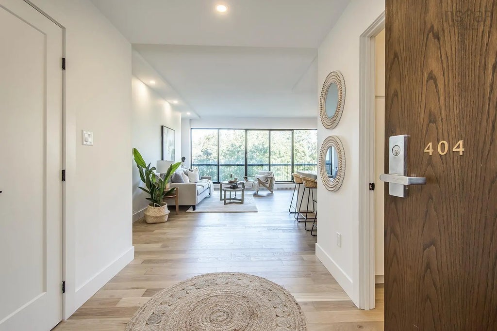 Step inside with me! This contemporary residence has been meticulously renovated to create a space that is beautiful, functional and inviting. Unit 404 at the iconic, Carlyle Condominiums in the vibrant South End of Halifax is a splendid example of neutral and monochromatic design with organic elements and a seamless flow. Its luminous design is expressed through 9ft ceilings and floor to ceiling windows, creating a stunning backdrop for any event. Offering a 1250sf open-plan, this 2 bedroom, 2 bath condo is nothing short of a showstopper! The kitchen is curated with quartz countertops, all new appliances, pantry and an oversized island to show off your culinary skills. The hardwood floors throughout, custom lighting, newly added in suite- laundry and reconfigured rooms are just a few highlights from this extreme makeover. The primary bedroom is elegant and dreamy, giving all the Zen feels. The sumptuous ensuite bath with marble floors, separate glamourous dressing room, walk in closet and bonus secondary closet will all add to your comfort and relaxation. The location itself ushers the perfect lifestyle with its proximity to universities, hospitals, fine dining and entertainment. One underground parking and storage locker included. The Carlyle has a backup generator making those stormy nights worry free. Life at the Carlyle provides an unmatched lifestyle right in the center of it all! Meet me at the Carlyle!