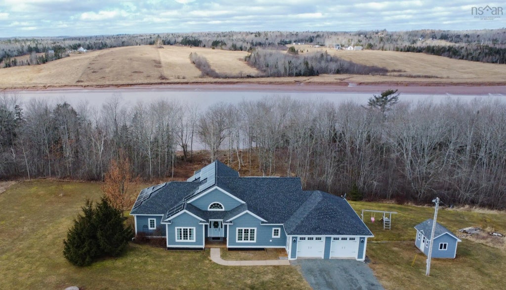 Nestled on 5+ acres of prime riverfront property, this bungalow awaits its next family to call it home. Only 5 mins from charming Stewiacke & Hwy access, this slice of paradise is a quick 28 min jaunt to Halifax Airport & 45 mins to Halifax. Quality reigns supreme with top-of-the-line ICF construction, Steffes ETS furnace with in-floor heat on both levels & solar panels for energy efficiency. The heart of the home is the great room, complete with a propane fireplace & floor-to-ceiling windows bringing the beauty of outdoors in. The dinette area's patio door leads to a large sun deck, perfect for savouring morning coffee & watching the tide come in & out in the Shubenacadie River. The sleek kitchen features quartz countertops, stainless steel appliances, walk-in lighted pantry & island. There is newly installed flooring throughout the main level. Off the kitchen you will also find a formal dining room, mudroom, half bath, & laundry room with front load washer & dryer. The double heated garage with workshop/storage room is accessed off of the mud room. The primary suite exudes elegance with large windows, walk-in closet, & a stunning 3 pc ensuite with walk-in glass/tiled shower. Another spacious BR & 3 pc bath complete the main level. The lower level finish is all above grade & offers a spacious family room with a bay of windows, electric fireplace & walk-out to the lower patio & backyard. The 3rd BR & bath with walk-in shower provide space for guests. The storage space, utility room, central vac & workshop with basement walk-out offer convenience. The house is wired for a generator, ensuring you're never left in the dark. Outside, find a storage shed, double driveway & ample space for gardening & taking in the stunning views of rolling hills & river. Follow the trails down to the river, the perfect spot for summer bonfires. Don't miss your chance to own a piece of paradise close to all the amenities you need.