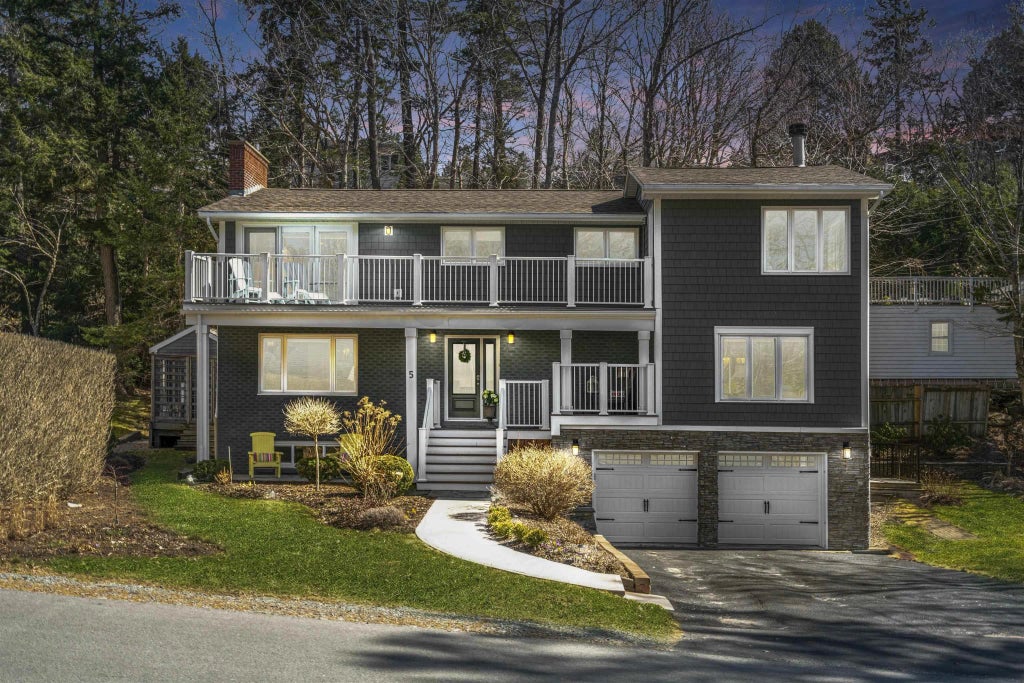 Nestled in natural surroundings with the ocean across the way, this home is singular in design and crafted to be enjoyed. The first impression of the wedgewood blue exterior, crisp white trim and accent stone is captivating, surrounded by lush gardens, tree canopy and the Basin just down the road. Step inside and be greeted by the warm glow of natural light and the inviting atmosphere of this beautifully maintained home. Enjoy winter evenings cozied up in front of the family room fireplace. Just across the hall, the tasteful dining room with refinished hardwood floors flow seamlessly into the stunning kitchen. The ample wood cabinets, granite countertops and large island make cheffing and entertaining a breeze. Whether inviting friends over or looking for a spot to relax in the sun, there's nowhere else to be except on the back deck. The stunning wraparound deck backs into the forest, surrounding one with nature's beauty & sounds. Upstairs has its special spaces too, with its airy bedrooms and stunning bonus room. The kids will love the spacious bedrooms, which share a generous full bathroom. It's easy to adore the master suite, complete with the private, smartly renovated ensuite and a widow's walk that provides an incredible space to start the day with breathtaking views of the Bedford Basin. The real showstopper on the second level is the bonus room, with its soaring cathedral ceilings, cozy wood fireplace, and sunset views of the basin. Whether looking for a private getaway or a stunning home office with ocean views, this room is magical! The basement offers plenty of room for storage and recreation, with a spacious rec room and direct access to the garage. The location is second-to-none. A quiet street near great schools, parks, and all the amenities of Bedford. Not to mention, public ocean access is just down the street. The perfect place to put kayaks in the water or just enjoy the ocean breeze! Come home to 5 Golf Links Road!
