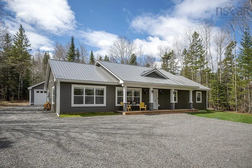Nestled in the privacy of the trees sits this upgraded, 2.5 years new, 3 bedroom, 2 bathroom bungalow. With 1 acre, a circular driveway, and a detached 24x26 wired garage, tranquility awaits all while being only a few minutes from highway 101 access. It is also the gateway to the Annapolis Valley and 20 minutes to the Halifax Regional Municipality (HRM). Upgrades include the double garage, in floor heating, quartz countertops and more. The open concept this home offers provides a modern and spacious feel. With a large living room and a great room, there is no shortage of living space. The master bedroom includes an ensuite and walk in closet. Two other bedrooms, a full bath, a spacious mudroom, and laundry room, complete this level. The kitchen includes attention to detail, pantry and dining room walk out to rear deck/patio space. The in floor heating provides comfort and luxury. With a covered porch, metal roof, and beautiful country setting- this home will welcome you the moment you pull in the driveway.