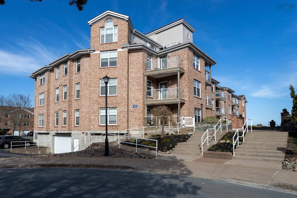 Brilliant Condo located on the Bedford Waterfront! Enjoy watching sail boats pass by from your private balcony. This one Bedroom one Bath condo is located in a beautiful building surrounded by a park like setting with spectacular landscaping including a courtyard with benches, water fountain and a waterfall garden leading to the boardwalk on the waterfront. Step into the bright open concept unit with an updated kitchen featuring granite countertops, stylish subway tile backsplash, built-in China Cabinet and Stainless-Steel Appliances. The spacious bedroom has a large double closet and is ensuite to the main 4-piece bath. This unit also includes in-unit laundry, storage room/pantry and a built-in desk area, perfect for working from home. The building has heated underground parking and an additional storage unit. This building also offers outside guest parking. Heat is included in the condo fees. Enjoy carefree living in a prime Bedford location close to all amenities. Book your private showing today.