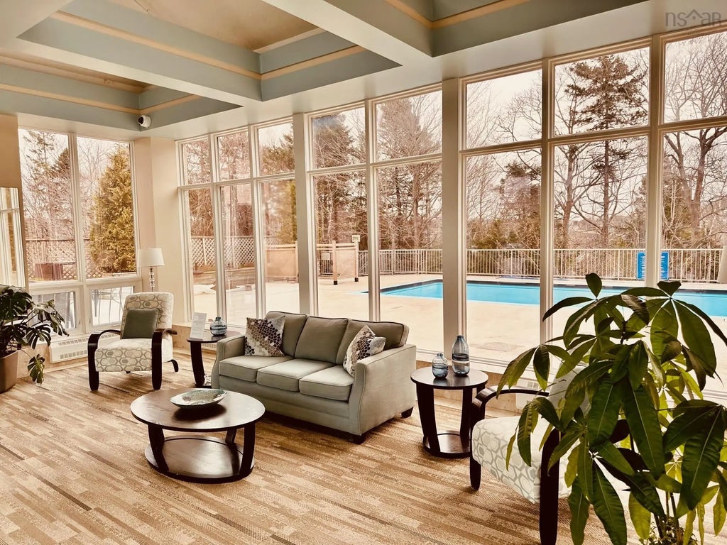 Beautiful one level condo unit, low floor with a walk out to your large 21' x 12' private patio (above the ground level) with a green space behind for your full privacy overlooking natural setting, the lake, trails, trees and lots of space for your flower and veggie boxes. This condo building offers great amenities including an outdoor, heated inground pool with a large pool deck and patio, fitness room, additional storage room unit, underground parking, guest suite, workshop room, live-in superintendent, social room, elevator, security and amazing location walking distance from Mic Mac Mall, Lake Banook and the the park with a sand beach, bike/walking trail and the playground. This unit has been upgraded over the years with a new kitchen, counter tops, flooring, light fixtures, SS appliances, heat pump, and it is freshly painted. Parking space # 40, Storage Unit # 103. Small pets accepted.