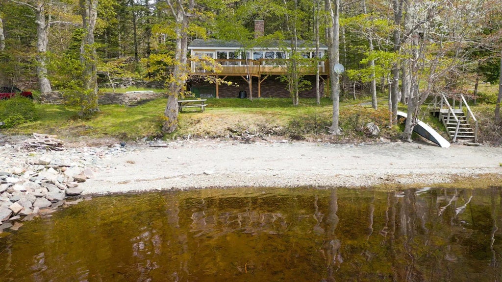 Waterfront 2 bedroom cottage sitting up high over looking Lake Ellenwood may be calling your name. Located 15 minutes from the Town of Yarmouth. Great lake for swimming, boating and fishing. Nice sunny shore line with a rock dock. This cottage is surrounded by rock walls with a rock fire put and mature trees makes this setting picture perfect. The large 2 level deck makes it a great place to entertain and or enjoy the outside. Park and walk up the concrete steps to cotttage and be wowed by the cozyness of the large living room which is along the whole front of the cottage. Large plank softwood floors and newer Kohler vinyl window allow lots of natural sunlight. Heated by electric heat. The fireplace is a working wood fireplace which adds to the cozyness. Electrical has been updated.