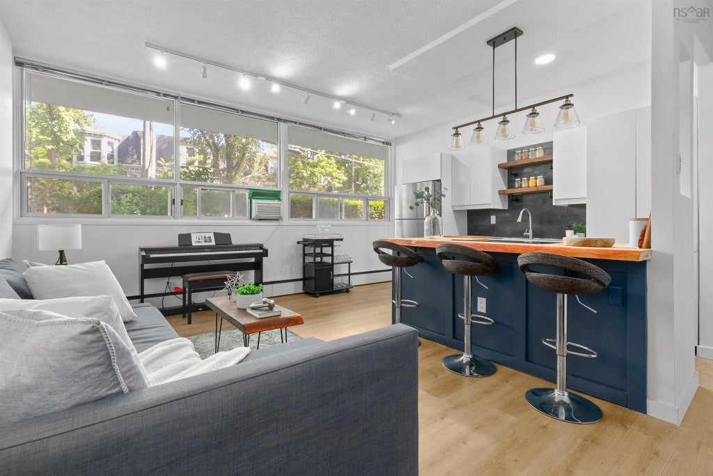 Location, location, location! This delightful one-bedroom condo, located in the heart of the South End of Halifax, offers a prime location within walking distance to St. Mary's, Dalhousie, and Kings University. It is also conveniently close to Point Pleasant Park, hospitals, and all the amenities provided by downtown Halifax. This main-level, corner unit condo has been thoughtfully upgraded. As you step inside, you'll notice the fresh paint throughout and an abundance of natural light streaming in from the wall-to-wall windows in the living space. The warm hardwood flooring adds a touch of elegance to the entire condo.The upgrades continue into the open concept kitchen, featuring two-tone Ikea cabinets with built-in "push-to-open" hardware. You'll find a large pantry with electrical outlets for your built-in appliances, along with custom open shelves made of 2" pinewood slabs supported by industrial L-brackets. The island showcases a custom-built 2" pinewood live-edge countertop, complementing the farmhouse style kitchen sink. The slide-in stove seamlessly integrates with the island's countertop, and a new faux stone backsplash adds a stylish touch. The kitchen is equipped with brand new stainless steel appliances, including a GE refrigerator, GE dishwasher, and Samsung stove and oven. The lighting upgrades add both functionality and aesthetic appeal to the condo. A 5-light hanging fixture with exposed Edison bulbs illuminates the kitchen countertop, creating a captivating focal point. Recessed LED lights provide ample illumination in the kitchen, while the living room features three tracks with three lights each, all controlled by a convenient dimmer switch. Condo fees include: $455.41/month and includes: water, heat, one underground parking spot, and one 4x4x8 ft storage unit. With its desirable location, stylish upgrades, and thoughtful features, this one-bedroom condo is ready to be your new home sweet home.