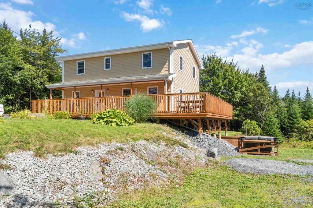 4 bed 1.5 bath on a 1.39 acre private country like lot! Only 20 min from Downtown, 5 min from Crystal Crescent Beach and 10 min to shops and services of Spryfield. Excellent layout on the main floor with mudroom, 1/2 bath/laundry, country kitchen with pantry, dining room with walkout to HUGE wraparound deck & front veranda, living room & 4th bedroom (no closet) and most of the main floor has new flooring. Upstairs is the large 4 pc main bath with soaker tub & shower, primary bedroom with walk in closet, 2nd & 3rd bedrooms & oversized landing with extra storage. The basement has an office/studio, large rec room with walk out to the included hot tub & 2nd walk out to back yard as well as 2 utility/storage rooms. The basement & main levels have ductless heats pumps for comfortable evenings & energy efficiency & generator panel for bad weather. The large private lot has the house away from the road & backs onto a nature reserve. The property has beautiful landscaping, gardens & enough privacy you can't see the neighbours! Gorgeous stone retaining wall all the way up the driveway. There is a detached double garage (30'X20') currently used for home based business with power meter & ductless heat pump & additional storage shed. 2nd driveway for added parking or potential for another building. Well maintained & updated family home in a wonderful location & stunning south facing wrap around deck! Quick closing possible.