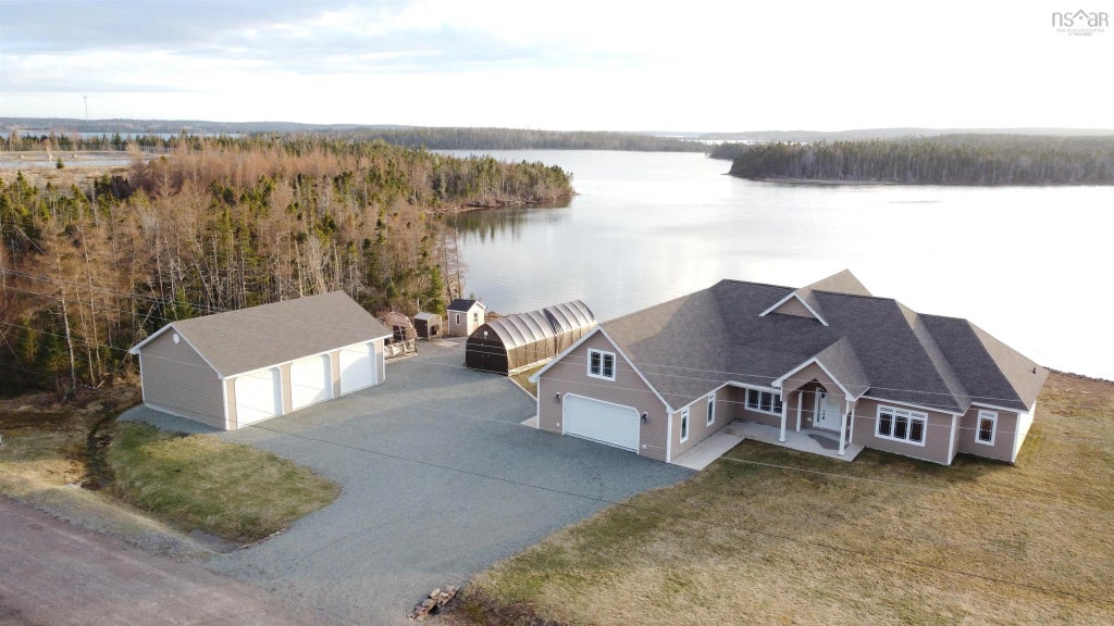 Virtual walk -thru tour & floor plans attached. Nestled in the heart of Cape Breton Island, this executive, 11 year old, waterfront property is a true masterpiece. With 3 spacious bedrms, 3 pristine baths, & an enormous upper loft, this home boasts over 3100 sq ft of luxurious living space. The sought-after bungaloft model offers an open concept floor plan that maximizes the stunning panoramic water views from every corner of the house. The gourmet kitchen is a chef's dream, featuring a vast island measuring 9.5 feet by 5 feet, adorned w/pendulum lighting & equipped with pot drawers, a built-in wine cooler, S/S appls an & abundance of cabinet and counter space, it is the perfect space to entertain. The primary bedroom features an expansive walk-in closet and a 5pce bath that showcases a corner soaker jet tub. A secondary master bedroom retreat offers a private 3pce bath & W/I closet, ensuring comfort & privacy. The third well-sized bedroom provides additional flexibility for your needs. Convenience is key in this home, as it includes a main flr laundry rm & utility room with an attached oversized garage which features interior access to the home. Furthermore, an additional, detached, three-car garage offers ample storage space for your boat, ATV or car storage for the auto enthusiast. This property is equipped with in-floor hot water heating fueled by propane or wood, ensuring warmth and efficiency during the colder months. What truly sets this property apart is the 450 feet of water frontage, offering both peace and privacy. Located just 20 minutes away from Port Hawkesbury, this home provides easy access to Dundee Resort Golfing, beautiful beaches, marinas, hiking trails, ATV trails, kayaking, fishing etc. It's the epitome of the East Coast lifestyle, allowing you to enjoy the natural beauty of Cape Breton Island to the fullest. Don't miss the opportunity to make this stunning waterfront property your new home! Pls note 2 dome tents in "as is" condition.