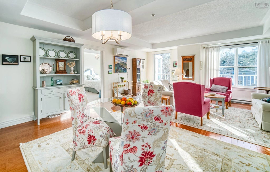 The Quinlan on Main Street in Mahone Bay is one of the most sought after condominium communities on Nova Scotia's beautiful South Shore. Sited along the gently flowing Maggie-Maggie River, amidst lovely landscaped grounds and gardens, this 1,200 sq. ft. two bedroom suite plus den, faces south-west and would be the ideal solution for an older buyer seeking a carefree life-style while maintaining independent living within a quiet, socially active, mature, adult environment. The central living area of the suite consists of a an open living-dining area with kitchen L featuring a recently installed, bespoke, Charles Lantz kitchen. The suite also features a separate entry-foyer with hall closet and a full guest bath to the left as one enters the apartment. The separate laundry is tucked away just off the kitchen and the central living area, with access to a sun-bathed balcony over the river, is flanked by a bedroom on each side affording privacy for visiting family and guests. The den alcove would serve well as either an at-home office or separate dining room. The building offers a second floor common room with full kitchen facility, dining area and sitting area in front of a cozy fireplace. The elevator is accessed from the indoor parking area and this unit's designated parking spot is directly in front of its own private storage room. The Quinlan grounds front on a sidewalk, and the alternative walk through the adjacent park to amenities, is certain to satisfy nature lovers and those who appreciate a stroll through the refreshing salt air to the sea. Just one hour's drive to downtown Halifax or Stanfield International Airport, this is truly a "lifestyle" offering.