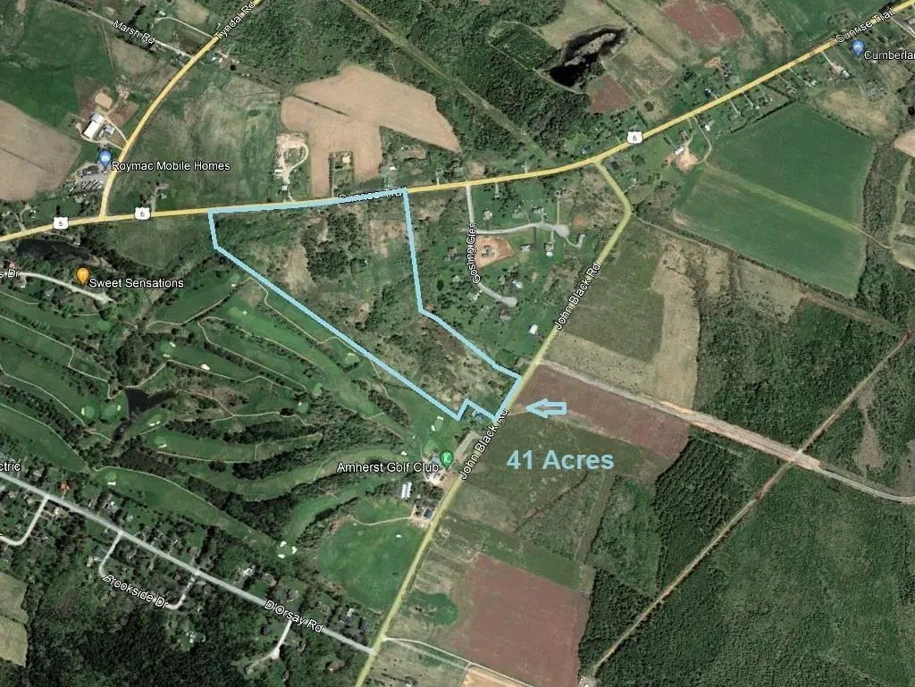 A very rare find as large parcels adjoining golf courses are almost non existent in Nova scotia these days. This approx 41 acre parcel has a large amount of frontage along the Amherst Golf course, as well as frontage on both Hwy 6 and on the John Black Road. It could easily be developed as a sub division with several high demand lots fronting the golf course or would make a great private estate. The possibilities are endless. Access can be had from hwy#6 by car on the existing lane that leads to the run down farm hous. Please do not enter the farmhouse as it is not safe.