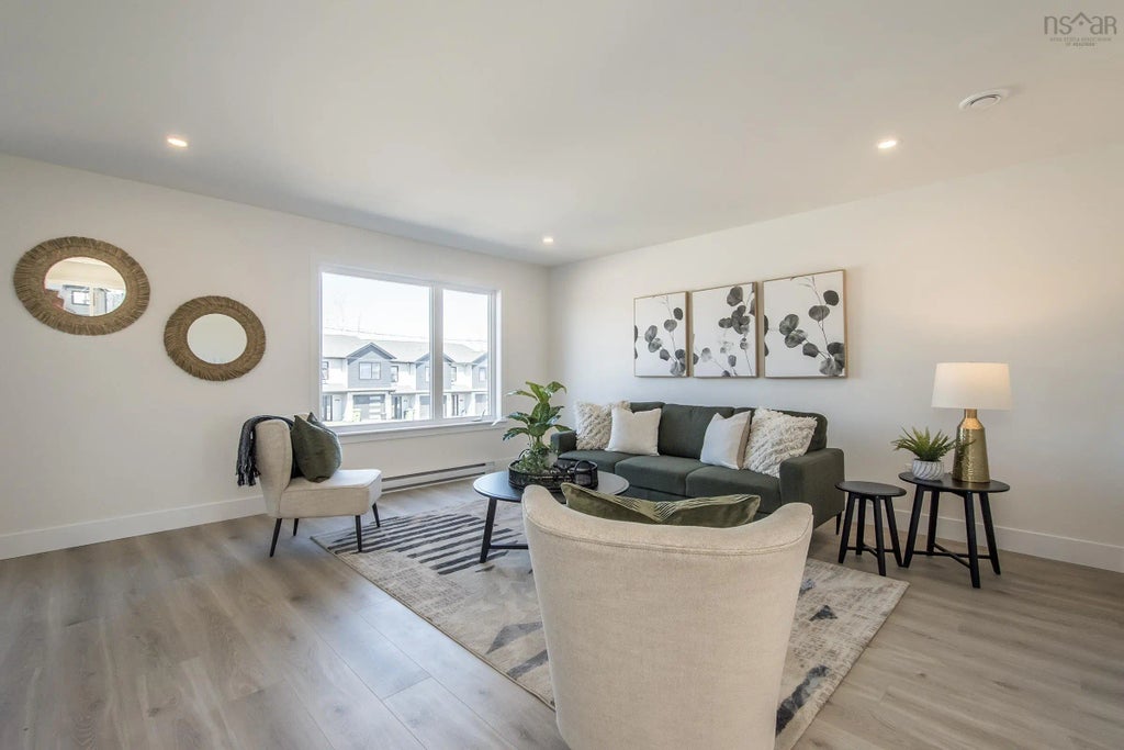 "The Guardians On Tyler" in the popular White Estates Community, Elmsdale NS. Community oriented and Family friendly area at 25 minutes from Dartmouth Crossings and from Halifax and at 10 minutes from the airport surrounded by lots of amenities and great schools. Watch your kids play safely on the cul-de-sac or in the back yard from your balcony. The Guardians are Modern & Warm Townhouses with black windows, black garage and main doors, Quartz Countertops throughout and hard wood stairs. Prepare to be impressed as you enter the bright welcoming ground level to a generous size rec-room with a full bathroom and a walkout door to the flat landscaped backyard to make the ground level a perfect space for family entertainment or add a door to make it a perfect separate space for a teenage child or visiting in-laws. The main level has it all with its open concept of a 19’x15’ living room, a kitchen with island, a dining room, and the powder room. Second level has 3 bedrooms, the master bedroom with ensuite bath and a walk in closet and two bedrooms sharing another bathroom plus a linen closet. The guardians are efficiently heated with electric heat and a heat pump for both heating and cooling and has a garage for getting into a “comfortable” car or bonus storage.