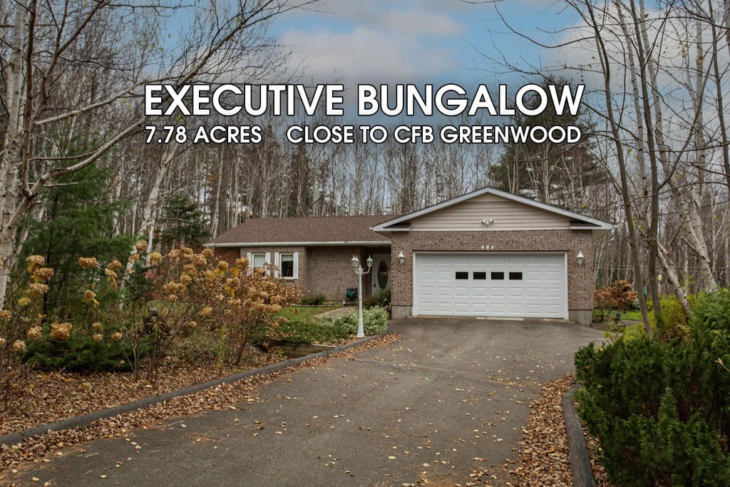 Welcome to your dream retreat! This meticulously maintained custom executive bungalow is a haven of comfort and style. With 3 beds and 2 baths, this home boasts hardwood and ceramic flooring throughout, creating an inviting and seamless flow. The massive living/dining area is perfect for entertaining, adorned with natural light pouring through large windows. The extra-large primary bedroom is a true sanctuary, featuring two closets and an ensuite bath for the ultimate relaxation. Imagine waking up to the serene beauty of this property every day. The potential for stunning valley views is within reach: just selectively cut a few trees and embrace the breathtaking scenery. Convenience is key with a paved drive, attached double car garage, and two storage sheds providing ample space for your belongings. The easy maintenance yard ensures you spend more time enjoying your surroundings than tending to them. Situated on nearly 8 acres, this property sits on flexible A2 zoning, opening doors to hobby farming and various other uses. The possibilities are endless. The motivated seller has priced this gem to sell, making it an exceptional opportunity for those seeking immediate occupancy. Enjoy the best of both worlds with a tranquil escape that is only moments away from the amenities of CFB Greenwood. Whether it's shopping, dining, or recreational activities, convenience is at your fingertips. Don't miss out on this rare combination of a well-maintained custom executive bungalow on a spacious lot with the added bonus of easy access to local amenities. Your dream lifestyle awaits—schedule a viewing today! [please note, property is being subdivided from a larger parcel; already underway]