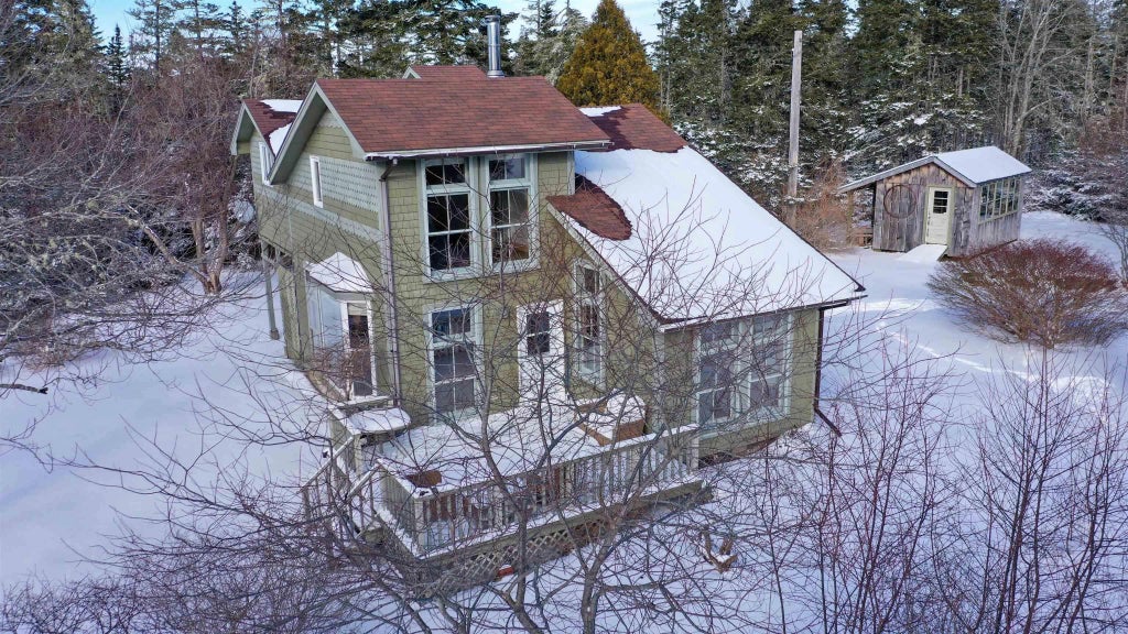 This property evokes beauty in craftmanship and details of the home, in its gardens and outbuildings and all details in and between. The 13 acre property is home to lush gardens of flowering beds, a mix of hardwood and softwood shrubs, 3 outbuildings (2 story garage with upper level guest suite, woodshed, gazebo), pathways leading to various areas, the occasional rock wall and a 2 saltbox reverse house designed by the original homeowner. Upon entering the property you are first greeted by the lower level of the garage, spacious parking area and ornate landscaping complete with a small garden pond with goldfish and seasonal man made waterfall. Drive further up the driveway and you will come upon the dwelling. The house is spacious with a large Eat in Kitchen with granite counter tops and a large window overlooking the backyard gardens. The living room has a half vaulted ceiling with a custom inlay of a rising sun. The bathroom and laundry are found on the main level as well and also have featured custom tile work and stained glass by the original owner and local artisans. On the second level, the hallway runs the length with an exit door for fire escape or would make a great spot to hang laundry on a line. The hall has a cupola adding in natural light. The primary bedroom has built in closets and large windows to overlook the property. There are 2 guest bedrooms and a new bathroom added by the current owner. Outside, off the patio, walk through the garden to the screened in gazebo made from post and beam with its large corner adobe fireplace. What a spot to hang out with friends and family for an evening of entertaining. The garage/studio is 2 levels with garage and storage on the bottom and newly added guest suite on the top. And less than 5 km from the beautiful Louis Head Beach!