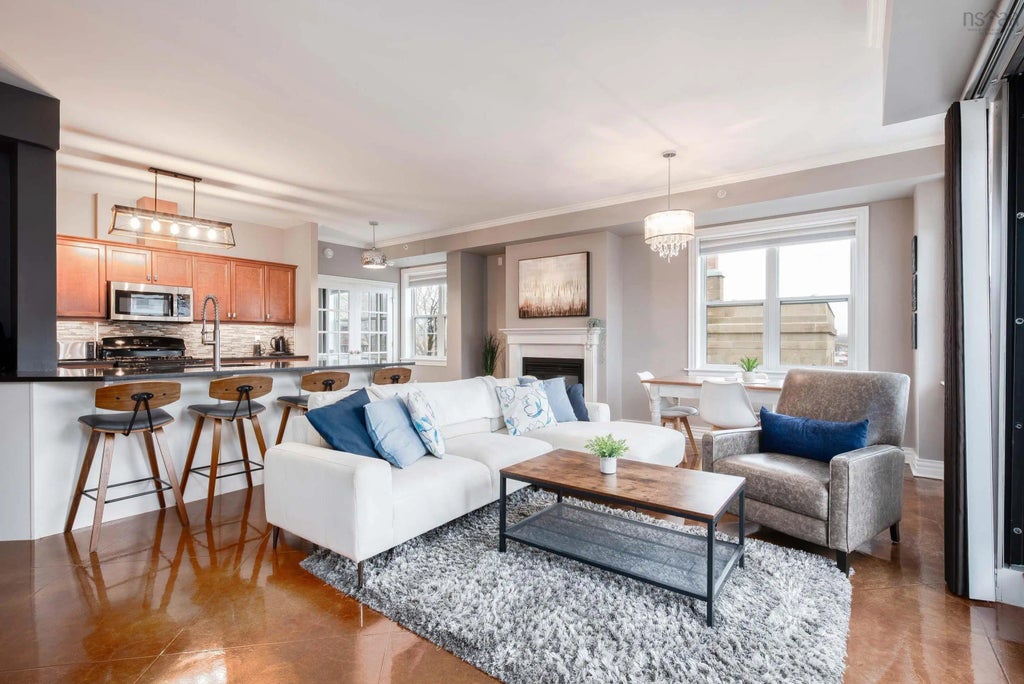 This isn't just a condo, it's a lifestyle! Welcome to one of the most sought-after buildings and locations in Dartmouth, Founders Corner. Unit 404 is a large corner unit with 2 bedrooms plus a den and 2 bathrooms. From the moment you walk in, you'll be immediately taken back by the immaculate finish level and features of this unit. With concrete floors and 9 foot ceilings throughout, the style of this condo is undeniable. The main area is an open concept design boasting the kitchen, dining room and living room with large windows, tons of natural light and a natural gas fireplace to set the mood on those cold winter nights. The high end kitchen is perfect for a master chef or an everyday grilled cheese master and has stone countertops, stainless steel appliances and a large island. Both bedrooms and the den are good sized rooms with tons of options and the primary suite has a walk-in closet and a full 4 piece ensuite bathroom. This unit has radiant in-floor heating and a ductless heat pump to keep you comfortable all year round. Founders Corner offers underground parking, a storage unit and 2 rooftop terraces with expansive views of Halifax Harbour and the Bridge. Sitting above Two If By Sea Cafe, you'll always have a place to grab a morning coffee and a bite. You're also close to several other Dartmouth hot spots such as: Battery Park, Yeah Yeah's Pizza, Celtic Corner, The Canteen, Oxalis, Dear Friend, Humble Pie, Alderney Landing Ferry Terminal, Brightwood Golf Club and Sullivan's Pond.