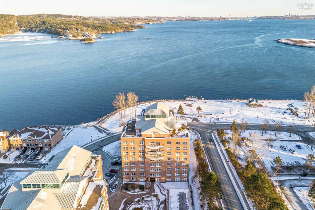 Very bright and open 2 bedroom plus den corner unit with amazing views of Bedford Basin. This is a raised first floor unit with over 1500 sq feet offering privacy and easy access from the main door of the building. No need to use the elevator. First thing you will notice when you enter the condo are the large windows to take in the water views from every room. This is the original owner and unit 104 is immaculate throughout, move right in. Spacious kitchen with tons of storage and lots of counter space. Perfect size primary bedroom with ensuite bath and walk-in closet. Bring your large dining room table there is lots of space. A bonus, this home has 2 big terraces off the living room. both with water views. Laundry room with newer washer and dryer. Condo fees include water, heating, use of outdoor heated pool, gym and heated indoor parking plus a storage locker. Make use of the classy Clubhouse for entertaining or just a place to get away to relax. The owner has installed a duct-less air conditioning system for added comfort and included are curtains and Bermuda shutters on the windows. Don't miss this rare opportunity to live in a quiet pet friendly premium building with all of the amenities Bedford has to offer. The onsite superintendent is very helpful and keeps the common areas spic and span.