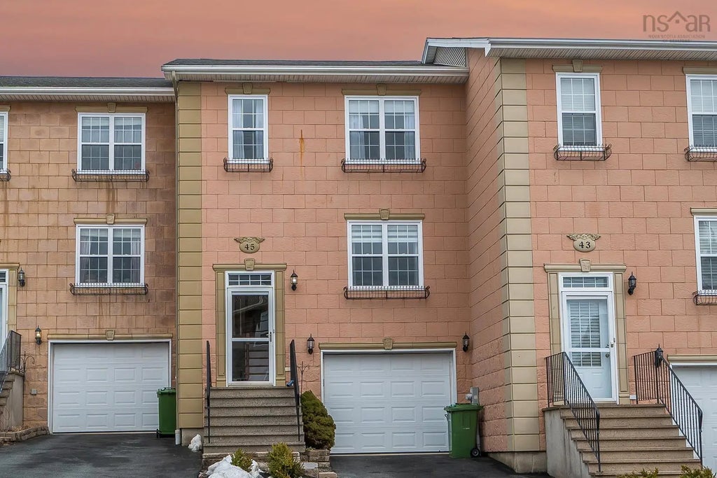 Welcome to 45 Brigadier Court, a 3 bedroom 4 bathroom (2 full, 2 half) townhouse nestled on a cul-de-sac, perfectly situated near all the amenities Bedford has to offer in Halifax, Nova Scotia. This charming home is meant for a convenient lifestyle while showcasing breathtaking views of the Bedford Basin. The main floor welcomes you with a harmonious blend of spaces. The living room provides a warm and inviting atmosphere, while the kitchen, featuring a peninsula island, seamlessly connects to a dining room for enjoyable mealtime and access to the back deck where you have views of the Bedford Basin. A cozy sitting room adds an extra touch of comfort, and a powder room ensures convenience for residents and guests alike. Recent upgrades in the home include updated lighting, new toilets, fresh paint, and new carpet. The upstairs living space features three bedrooms, including a generously sized primary bedroom with beautiful views, a walk-in closet, and a luxurious ensuite bathroom. Updates in 2023 include new carpeting upstairs and on the stairs. The remaining bedrooms, one currently serving as an office, offer versatility for your lifestyle needs. A well-designed main bathroom and conveniently located laundry machines complete the upper level, ensuring both practicality and ease. The lower level, accessible both from within the home and via the single-car attached garage, adds an extra layer of functionality. Here, you'll find an additional powder room, utility room, storage room, and a versatile recreation room, providing numerous possibilities for customization to suit your needs. Beyond the thoughtful layout and convenient amenities, this upgraded townhouse at 45 Brigadier Court promises a lifestyle that combines comfort, functionality, and proximity to the vibrant community of Bedford. Explore the beauty of living in Halifax, Nova Scotia!