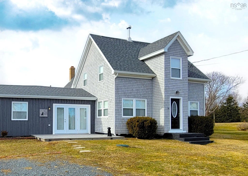 The centuries old fishing village of Blue Rocks has often been compared to Peggy's Cove - for both its charm and rugged, coastal beauty. The upscaled, casual design of this former fisherman's house is currently used by its owner as a year-round vacation property and would serve well as both a year-round home or family retreat. Located less than five minutes drive from the UNESCO protected town of Lunenburg, this property offers both convenience and an "other worldly" life style. The house is a minute's walk to the ocean and for anyway who defines happiness as a quiet walk with the dog early in the morning, this location is, frankly, ideal. The house is comprised of an original heritage home on two floors with an attached recreation wing converted from a former fisherman's gear and work shop for a total combined living space of 2,200 sq. ft. The "L", heated by both electricity and a wood burning stove, would serve perfectly as an artist's studio or summer bunkhouse for children. The side entry joining the main house to the recreation room adapts ideally as a summer dining-room off a large deck - just right for entertaining a crowd. The front entry has an intimate living-dining area to the left and a broad galley, eat-in kitchen to the right. To the rear of the kitchen one enters a large laundry, with an alternative outside entry, and to the rear of the dining-room there is a separate, cozy den with an additional wood burning stove. The second floor features two bedrooms, a large common room or library and a beautifully outfitted bath with separate shower and tub. A newly constructed garden shed, with steeply pitched roof, is accessed from an exterior door from the laundry. The front deck off the side entry offers lovely views over the ocean. The spine of the house runs along a north-south axis, the front faces east and the rear faces west. Be you a "doer" or a "dreamer", this home is a stroke of luck at an affordable price point bathed in a cool summer breeze.