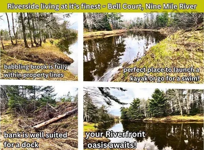 Looking for a waterfront building lot? How about one with over 220 feet on Nine Mile River and a private creek? This 1.7 acre lot is high and dry with easy access to the river for kayaking, fishing and swimming. A babbling creek runs along the left side and empties into the river. It is fully on this property, so you will control both sides of the creek. A well-built driveway with culvert is already in place. The land is cleared and ready for your dream home build and a C3 septic system plan has ben pre-approved (allowing for 3 bedroom home). A few hardwood and softwood trees have been left for aesthetic reasons. Nine Mile River bends right in front of this property, providing stunning views in both directions. The river bank slopes gently up from the waters edge, providing a stable bank, protection from flooding and yet it is easy to access on foot for all your water hobbies. The ideal location for a dock would be on the area closest to the creek. This is a highly sought after location - just minutes from the Superstore in Elmsdale, the new aquatic centre, the 102 Highway and all amenities. Just 15 minutes to the Airport and 40 minutes to downtown Halifax. A new access road to Bell Court from Highway 14 is almost complete, making the commute even faster! River Country Estates is an executive-type community with high end, quality homes and restrictive covenants in place to protect your investment. This new subdivision is popular with families because of the wide, safe streets and numerous hiking and ATV trails. The road is municipal owned and well maintained. NOTE - The road is known as "Bell Court" but signage still says "River Country Drive." Be sure to watch both video tours! *This lot is HST exempt.