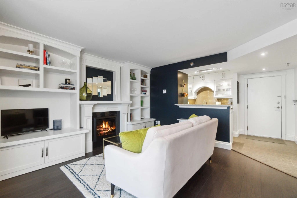This beautifully finished 1 bedroom 1 bath ground-floor condo is conveniently located close to downtown, schools, shopping, and transit. This cozy condo packs a punch with sliding French pocket doors, granite countertops, a custom kitchen with ample storage and workspace, custom built-in wall unit with electric fireplace, wide-plank laminate flooring with ceramic in the kitchen and bath, in-suite laundry, European tilt-windows, available in-unit air conditioning, and harbour views. This secure, quiet, well-managed building has a live-in super, gym, common room, and community garden. The low condo fees, accompanying storage unit, and beautiful finishes offer a great opportunity for easy condo living at a great price. New water heater in 2023, new dishwasher in 2024. Building is pet-friendly with approval.