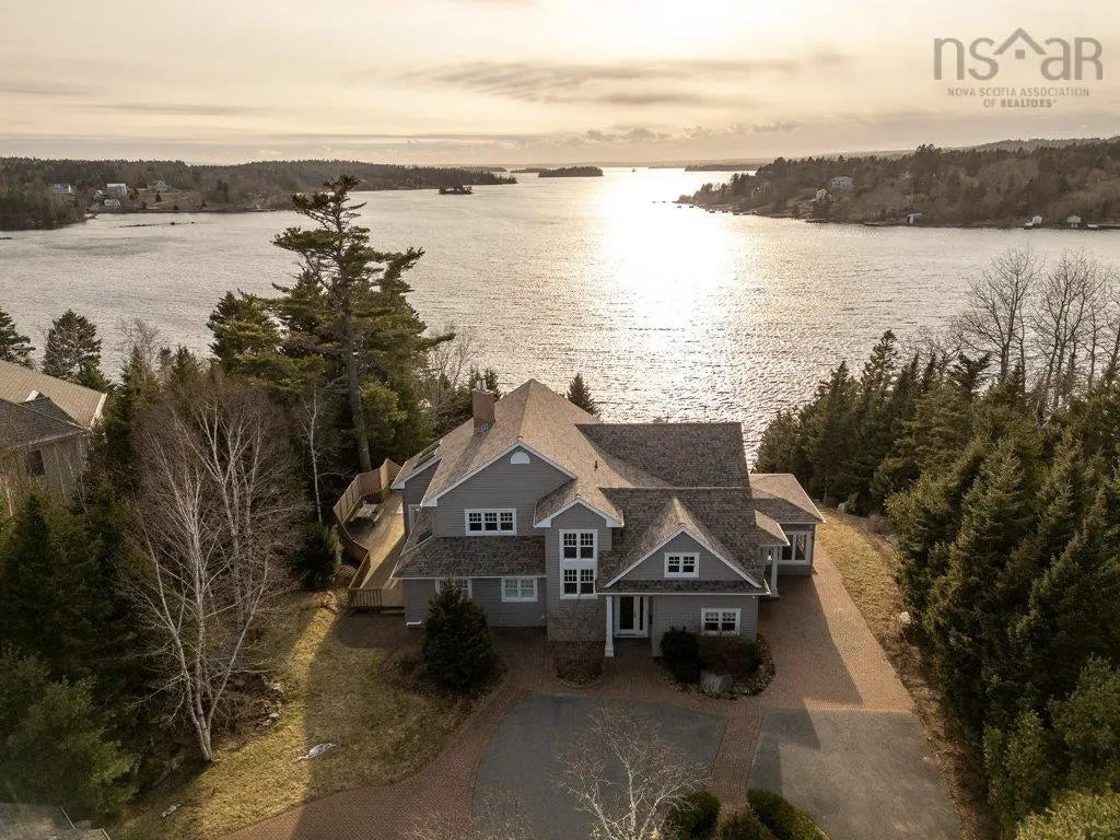 Located in an exclusive neighborhood on Sheep's Head Island, 2 Blue Heron Lane sits proudly overlooking St. Margaret’s Bay with elevated westward ocean views and 163 Feet of prime oceanfront. The turfstone driveway leads you to a secluded opening surrounded by curated gardens and mature trees. Upon entering this home, the foyer captures one of the best views that the Island has to offer. Soak up the sweeping panoramic vistas from this elegant and beautiful space which is enhanced by the display of lovely hardwood floors, high quality finishes, and crown moldings adorned by a new coffered ceiling. The custom kitchen features a breakfast bar island and a dreamy butlers pantry with an additional oven, dishwasher, fridge, and a convenient side door. The main level primary suite has a spacious walk-in closet and is topped by a luxurious 5pc ensuite with a soaker tub, a custom shower, and heated tile floors. Separated from the spacious king bedroom by french doors is a bright den that has vaulted ceilings with skylights, a propane fireplace, and access to a private two level deck. A formal dining room links the den and living rooms together, with a grand fireplace as the focal point. Beyond the main level are many additional spaces including a secondary suite, heated sunroom, private study, gym, and more! The stunning colours of westerly sunsets are enjoyed from both inside and outside at this fantastic property. This boater & swimmers paradise also has a boat ramp and flagstone patio fire pit, making it a popular summer hangout spot with family and friends. At the water's edge is a wharf with a float and a new boathouse. Not to be overlooked is the detached three car garage that is fully insulated with in-floor heating. Sheeps Head Island is an established neighborhood located under 10 minutes from all amenities in Tantallon, just 30 Min to Halifax, and 40 minutes to the International Airport.