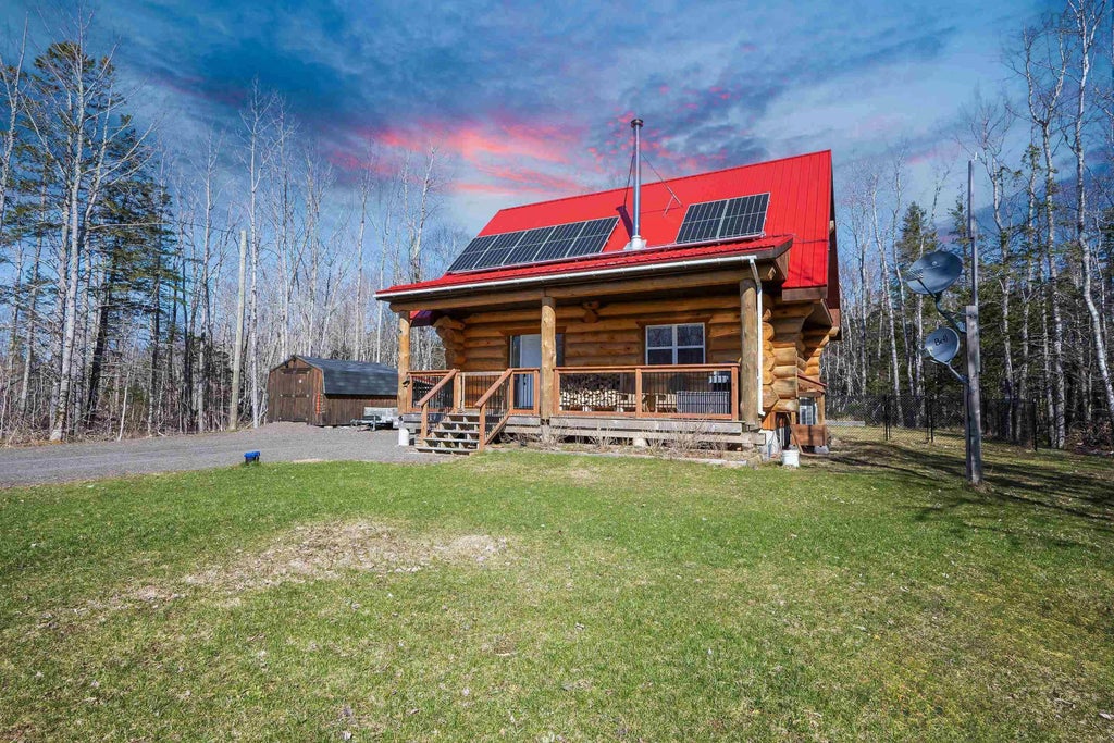 Welcome to the good life. Have you ever dreamed of living in a custom log home located on a private fenced lot, surrounded by trees, raised vegetable beds and only a few minutes’ drive or cycle to the iconic Bay of Fundy? This exquisite new log home with its picturesque red metal roof was crafted by Heartwood Log Homes in 2022 and is designed for sustainable living. 5.06 Kw of solar panels on the south-facing roof bring power bills to a minor expense, while inside the eye-catching auburn Pacific Energy wood stove and Mitsubishi heat pump mean that comfort is a way of life. Warm to the touch compared to conventional builds, log homes have thermal mass, a natural property that helps to keep inside temperatures comfortable in all seasons and allows the log walls to collect and store energy, radiating it back inside. Rustic, peaceful and 20 to 30% more efficient than typical builds, this home is also high tech and perfectly laid out. An open-concept main floor features a well-equipped kitchen and living area with examples of fine craftmanship at every turn, including the cathedral ceiling. A two-piece bathroom and a main-floor bedroom with closet complete this level. A handcrafted staircase with branch-like spindles and balustrade brings you to the second level, featuring the large primary bedroom with its walk-in closet and hand-scribed timbers overhead. An additional room serves as an office/music room that could easily be converted into a third bedroom. A three-piece bathroom completes this level. All the LG appliances are new and rated high efficiency, the home is wired for fiber-op and for a back-up generator in case of power outages, and the 6-foot-high, heated/insulated crawl space, accessed from outside, has excellent storage room. Minutes from walking trails, Margaretsville beach and waterfall nature preserve, Kingston/Greenwood and all the riches that the Annapolis Valley has to offer – orchards, vineyards, fields and forests – this home is a gem.