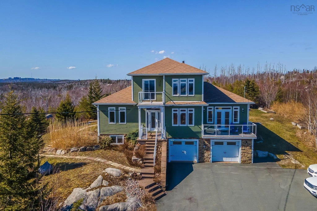 Only 10 minutes' drive from the Armdale roundabout and peninsula Halifax, 87 Aarons Way feels a world apart. With sweeping sea views of the approaches to Halifax Harbour from the front and over the McIntosh Run wilderness recreation area from the back, this house makes a big first impression. It has three levels, an extra-large double garage plus a detached utility shed, two balconies, beautiful stone and cementitious board exterior and close to three acres of land. Inside there's a sense of spaciousness with the main floor's nine-foot celings, open-concept living areas and large windows. The dining and living rooms feature a stone accent wall and a propane fireplace, and enjoy access to a deck and stone terrace to the rear and a balcony to the front. The kitchen has granite countertops, an eat-in centre island and custom cabinetry, top-of-the-line JENN-AIR appliances in a sleek brushed bronze oil finish, including a microwave, oven, dishwasher and fridge. The 5-burner propane range is an Italian-made FULGOR MiLANO. There's also a wine fridge and prep sink. A conveniently located laundry room/pantry, two spacious bedrooms and a full bath complete this floor. Above you will find a primary suite which includes an office, a very large main bedroom with a two-sided propane fireplace opening up to a spa-like ensuite bath. There's an air-jet two-person soaker tub, spacious walk-in shower and double vanity with soapstone countertop, and a large walk-in closet with built-in cabinetry. The lower level has an additional bedroom, a hobby room, another pantry, a full bathroom, and access to the garage. The house has comfortable year-round temperature control thanks to the geothermal heat and air conditioning system and lower level in-floor heating. The backyard features a propane fire-pit, pergola, stone patio, spacious back deck and fenced 12 ft. by 16 ft. vegetable garden with raised beds. The built-in Control 4 system provides music indoors and out.