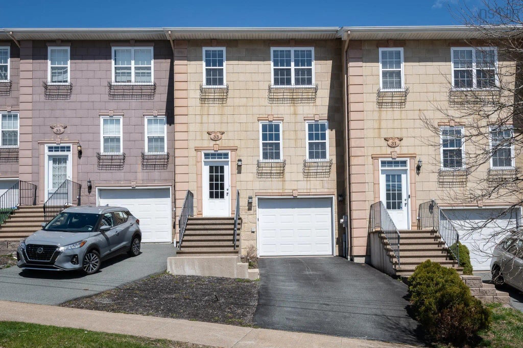 A handsome townhouse unit on a quiet cul-de-sac, in popular Hemlock Ravines, with a back deck lounge area that has views the Bedford Basin. Inside, the ceramic-tiled foyer with hardwood stairs lead into a lovely living room with crown mouldings and walnut-stained birch hardwood floors. Open concept kitchen/dining/family-room (or den) area at the back, with exit to the elevated deck and leading to backyard. Kitchen has extras, such as recessed lighting, cherry-stained birch cabinets, crown mouldings, and breakfast bar. Upstairs the large master features a walk-in closet and ensuite with separate shower and corner water jet-tub. Two other well sized bedrooms, a full bath, and convenient laundry complete the upper level. Basement features ample rec-room, a full bath, storage, plus heated built-in garage. The gorgeous "sandstone tile" exterior cladding is nicely detailed with contrasting corner blocks, window & door headers with keystones, & wrought iron window boxes, giving the look of a century-old character on a 19 year old townhouse.