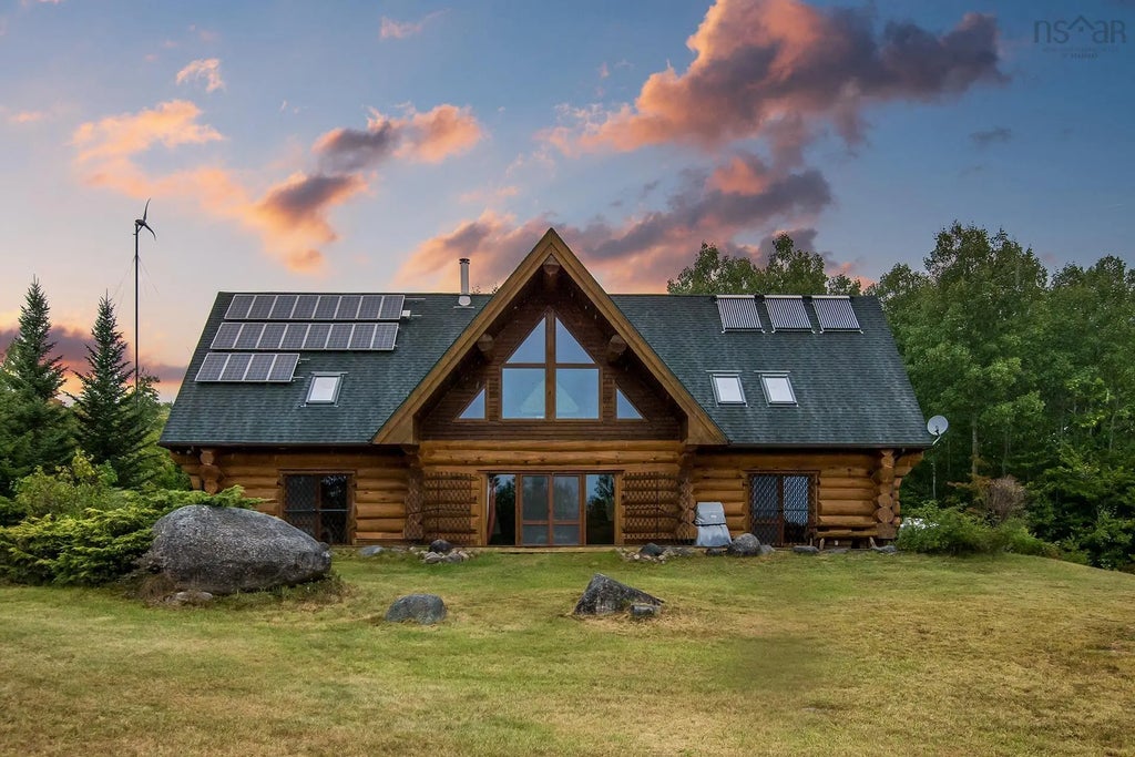 Once in a lifetime opportunity awaits in Nova Scotia. Majestic Heartwood Log home situated on 128 acres of mixed trees and app.1200’ of lakefront. Completely off grid, with in floor radiant heat powered by solar hot water system with propane furnace for back up. Complete seclusion and privacy yet close to all major amenities. The large logs (up to 60 cm) used have fully settled, making the home very energy efficient. Approx. 3000 ft of opulent living space, with slate floors throughout, solid marble vanities, marble mosaic tiles, hand carved furniture. Iron decorative security grills hand made by Prague blacksmith. Open kitchen, dining and living room with cathedral ceilings and a 7 foot-tall marble fireplace is a stunning focal point of the main floor. Two bedrooms, bath and half, laundry, and utility room, complete the main floor. Beds are all hand carved from Asian Rosewood. European grade energy efficient windows and patios doors with double glazing and vent system. Electricity is drawn from solar and wind turbine. Second level has two more spacious bedrooms with a shared bath as well as a master with luxurious en-suite and private balcony. A short walk to lakefront brings you to a large natural sand beach. Only year round home on the lake. Lake is app.4 meters deep, with a gradual shoreline, great for swimming, fishing for trout and kayaking.(and float planes) Wood fired sauna imported from Finland and storage shed located down by lake. 15 minutes from New Germany, 30-40 minutes from Graham Cook designed Osprey Ridge Golf Course, 50 min. from UNESCO Town of Lunenburg, and sandy oceanfront beaches of Rissers Provincial Park. 90 minutes to Halifax and Stanfield International Airport. Log home sits on 128 acres. HST is applicable, included in the purchase price. Full list of inclusions, upgrades and luxury finishes available. Batteries replaced this fall. Additional land with lakefront available. Road upgraded with culverts and gravel