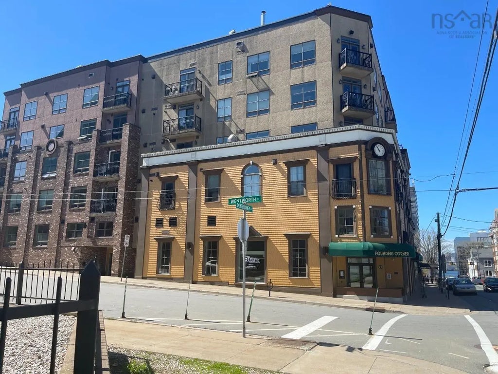 Located in the luxurious Founders Corner building, this executive style 1 bedroom + den condominium in the heart of Downtown Dartmouth offers all the conveniences of an upscale unit. This unit shows like a dream with its open concept design, 9-foot ceilings, and polished concrete floors featuring in-floor radiant heating. The spacious living room is perfect for entertaining friends and family, while the kitchen boasts a breakfast bar, a gas range and all appliances included. This unit includes the primary bedroom, den, laundry room with a utility sink, and storage. There is a small balcony to enjoy your morning coffee or afternoon tea. Additionally, the common spaces feature a rooftop solarium with BBQs for communal usage and stunning views. Conveniently located and within walking distance to various amenities including restaurants, walking trails, the library and just a few minutes from the Halifax Ferry. This Unit has 2 storage units #10 Ochterloney Street and #201 Wentworth Street.