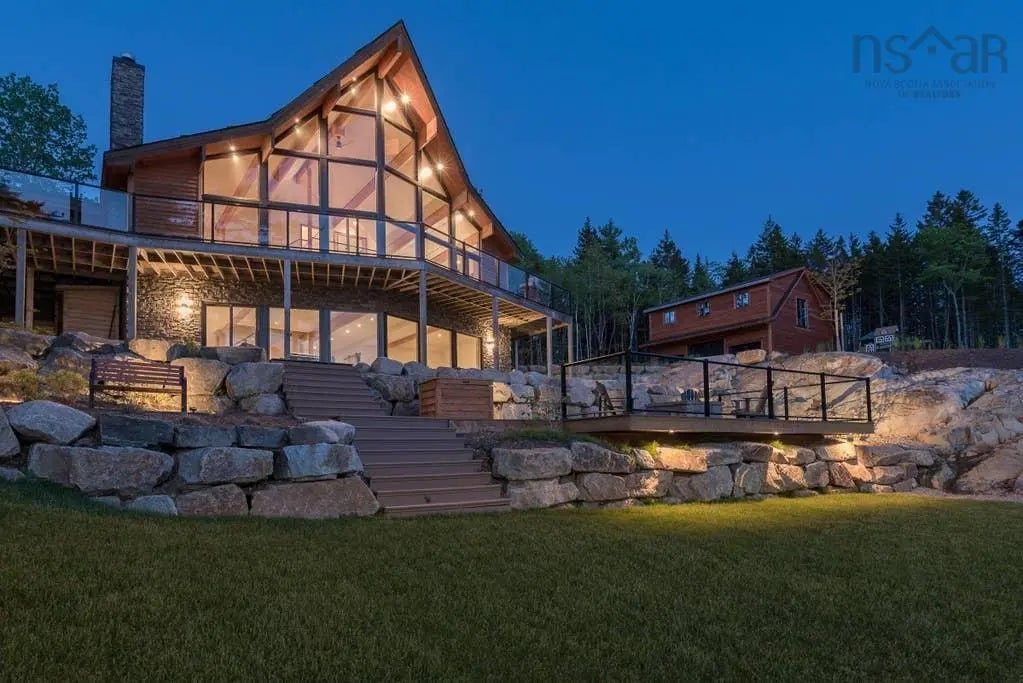 Welcome to your exclusive lakeside sanctuary at this stunning Lindal Post and Beam Western Cedar chalet-style villa, beautifully situated on the shores of Cockscomb Lake in Mt Uniacke. This enchanting family residence delivers a life of luxury with awe-inspiring views, making every stay a tranquil retreat. Step into the grandeur of the great room, with its floor-to-ceiling windows that frame stunning lake vistas, complemented by high-end finishes such as engineered hardwood floors and soapstone countertops. The open floor plan seamlessly connects to a chef’s kitchen, equipped for culinary adventures, and a cozy sunroom, the perfect nook for relaxation amidst a private forest backdrop. This home spans three meticulously finished levels, featuring five generously sized bedrooms. The main level includes two bedrooms, a full bath, and a laundry room, all accessible from the wrap-around balcony that invites the outside in. Ascend to the upper level where the master suite awaits, complete with a spa-like bathroom and a luxurious soaker tub designed for serene moments. The lower level is an entertainer’s paradise with polished concrete floors, ample seating, and a large bar with seating for five. It includes two additional bedrooms and another full bath, providing plenty of space for guests or family. The exterior of the property features professionally designed landscaping completed in 2018, enhancing its charm with a quaint lakeside beach, a cozy fire pit ideal for evening gatherings, and a functional aluminum docking system. Additionally, the detached three-car garage presents expansion potential, with space already wired, plumbed, and framed for two additional bedrooms, a common area, and an extra bathroom—ready for the new owner's finishing touches. This property is not just a home; it’s a lifestyle destination where every detail caters to comfort and luxury. Click on the virtual tours to view more.