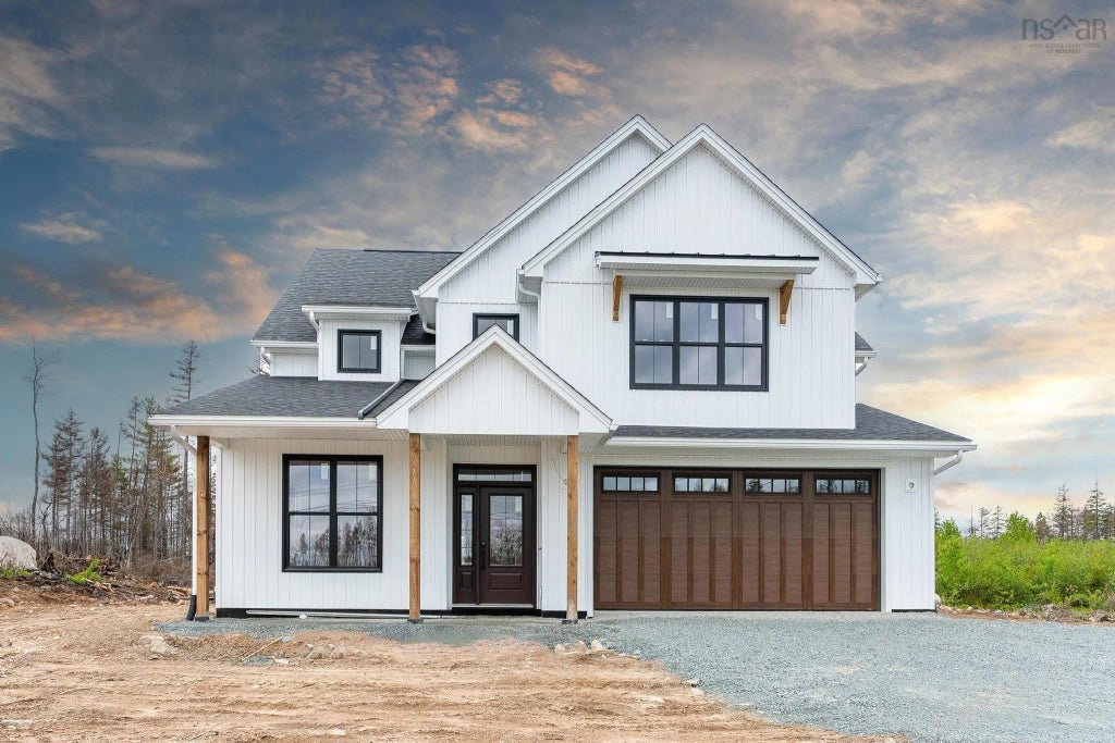 Welcome to 472 Hemlock Drive! Ridgecraft Builders is happy to present this beautiful, newly-built slab on grade home in the sought after Westwood subdivision. Upon entering through the covered front porch, you will be greeted by a beautiful 2 storey front foyer. The den is tucked away off the front foyer, providing potential for a more secluded office space or rec room. The front hall, complete with powder room, leads to the open and spacious 9’ tall living room, kitchen and dining room. The kitchen, laundry room and bathrooms are to be outfitted with custom mother Hubbard's cabinetry with solid surface countertops, ensuring beautiful quality and continuity throughout the house. The patio door provides an abundance of natural light as well as access to a covered backyard slab. The back hall includes a mudroom leading to the back door. Upstairs you will find 4 bedrooms and 2 baths, including a large primary bedroom featuring a walk in closet and ensuite bath to be completed with in-floor heating, 2 sink vanity with make-up table and linen towers, a stand-alone tub and a curbless walk-in shower with rain head. On this level you have another full bathroom, to be outfitted with a double sink vanity and an alcove bathtub and shower and a laundry room featuring a laundry sink. The spacious 2 car garage provides ample storage along with a beautiful “chocolate walnut” style garage door to compliment the front door for stunning curb appeal. The house features a ducted heat pump The surrounding community includes schools, Winslow drive park, St Margaret's community center and arena, and a skate park, in addition to being only minutes from all of the amenities Upper Tantallon has to offer.