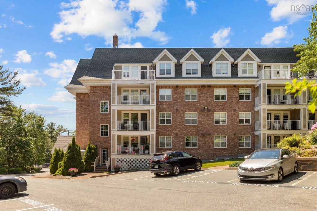 Welcome to this meticulously maintained 2 bedroom, 2 bathroom condo on the top floor of Brookshire Mews. Nestled in the woods amongst manicured gardens, trails and tall trees, this building is extremely well maintained and has quick access to the 102 or Bedford Hwy and all amenities one could need. Plus, Papermill Lake is just down the street! Inside, this carpet free unit greets you with an open layout featuring gleaming engineered hardwood throughout the main areas and bedrooms, in-unit laundry and separate storage room, formal dining room area, large kitchen with ample cupboard and counter space with room for breakfast table, bright living room with newly tiled area leading to the sun filled balcony (top floor so it is open to the sky for seeing the stars or sun tanning) with new railings, Duradeck floor and privacy wall. 2 ample sized bedrooms that both have window dormer bump-outs (unique to top floor) with the primary bedroom having large his/hers closets and ensuite bath with sliding barn door. Recent upgrades over the past few years include both bathrooms being updated with new paint, light and tap fixtures, sinks, toilets, counter tops, tub/shower enclosure with walk-in shower in the ensuite (both with safety grab bars). New air exchanger, updated kitchen counters, sink+taps and professionally sprayed cupboards, 4 ceiling fans with medallions, new fridge, stove, washer, dryer, Phantom screen door to deck and Hunter Douglas power blinds in living room. Condo fees include elevator, hot/cold water, in floor radiant heating (natural gas), indoor heated parking with storage unit live-in superintendent and property maintenance. Pet friendly! This unit is in move-in condition.