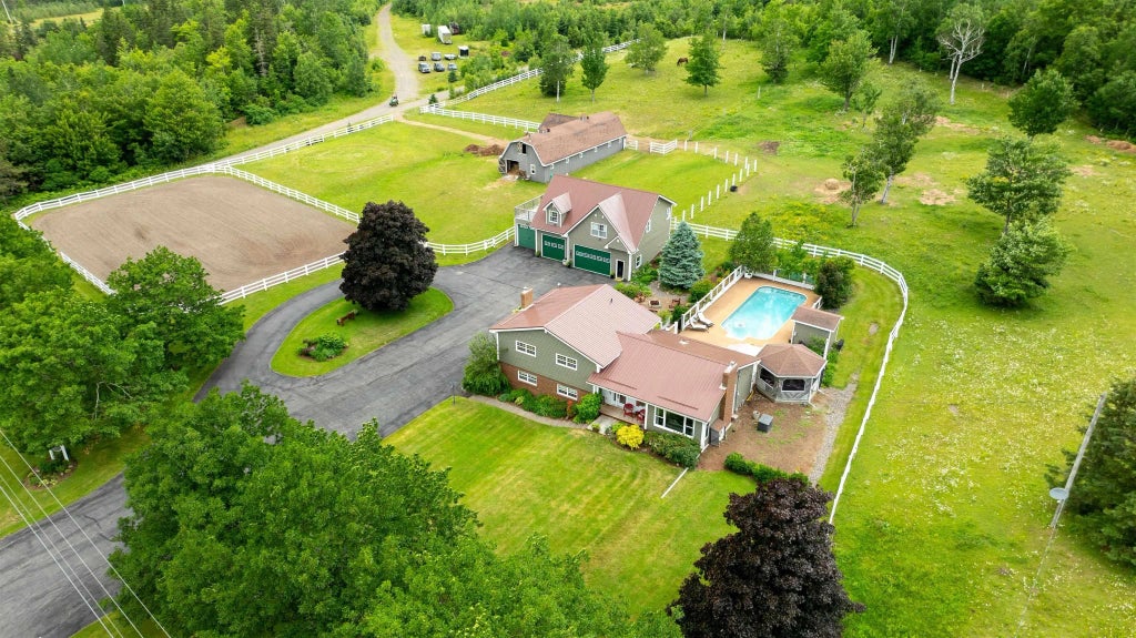 Welcome to your dream horse farm retreat nestled in the serene countryside, just 15 min from Antigonish and 20 min from New Glasgow. This exceptional property spans 6.1 acres and offers over 3,400sqft of living space among 3 structures, including a beautifully maintained and fully operational horse farm. The centerpiece of this property is the impressive barn; wired, heated and plumbing, there is a Tack Room, 5 stalls (foaling stall incl) and two storage areas (hay and sawdust) with exterior receiving hatches. The main residence has been meticulously refurbished to blend country charm with modern convenience. Highlights include a chef's dream kitchen with a 48" Thor gas range boasting dual ovens, perfect for culinary adventures. Relaxation awaits with your own private in-ground salt water pool (16x38), Hot Tub & Pool House (shower, change room & utility); enclosed by high fencing of elegant glass, wood & iron gates. There is also a screened-in Gazebo overlooking the lush gardens and stonework, and a fire pit for outdoor gatherings. These landscaped grounds are graced with old-growth trees, picturesque gardens, and framed by classic white farm fencing. Developed horse areas include a riding arena, fenced barnyard, and two pastures, complemented by sloping wooded land beyond, providing ample space for exploration and privacy. For those who require connectivity, high-speed internet is readily available, ensuring seamless work-from-home capabilities. The main house is designed for comfort and functionality across 4 levels (3 bed,2.5bath). The Carriage House features a loft suite (1bed,1bath) and garage/workshop with 2pc bath. This is more than just a property; it's a lifestyle opportunity waiting to be embraced. Discover the joy of country living combined with modern comforts in this meticulously crafted horse farm retreat. Book your private tour today and envision yourself calling this picturesque estate home.