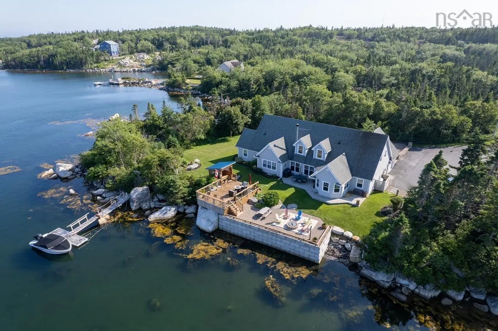 Experience the epitome of coastal living in this exquisite 5-bedroom, 4-bathroom home, nestled on over 5 acres of pristine land and boasting approximately 1,600 feet of oceanfront. The expansive living room is a haven of natural light, featuring breathtaking ocean views, vaulted ceilings, and a stunning stone fireplace that serves as the room's centerpiece. The chef’s kitchen, complete with a cozy dining nook, breakfast bar and direct access to the back patio, is perfect for both everyday meals and entertaining. The main floor hosts the luxurious primary suite, offering a generous spa-like ensuite for ultimate relaxation. Two additional bedrooms on the main floor provide ample space for family, while an office ensures a quiet place for work, study or flexibility as a guest bedroom. Ascend from the living room to discover a versatile family room, ideal for a media space. Above the attached garage, a fully equipped secondary suite awaits, featuring a kitchenette, den, bedroom, and 3 piece private bathroom – perfect for accommodating out-of-town visitors. Step outside to your private dockside bar, where you can enjoy entertaining while soaking in the serene water views. With your own dock and boat launch, aquatic adventures are always within reach. The meticulously maintained grounds include paved driveway, a large detached garage and charming veranda, an ideal spot for relaxation as children play in the lush surroundings. Conveniently located just a short drive from Crystal Crescent Beach, as well as the scenic trails and waterways of The Loop, this home offers the perfect blend of privacy, tranquility and accessibility. This seaside retreat truly has it all – elegance, comfort, and a connection to nature with ample wildlife. Make this dream home your reality.