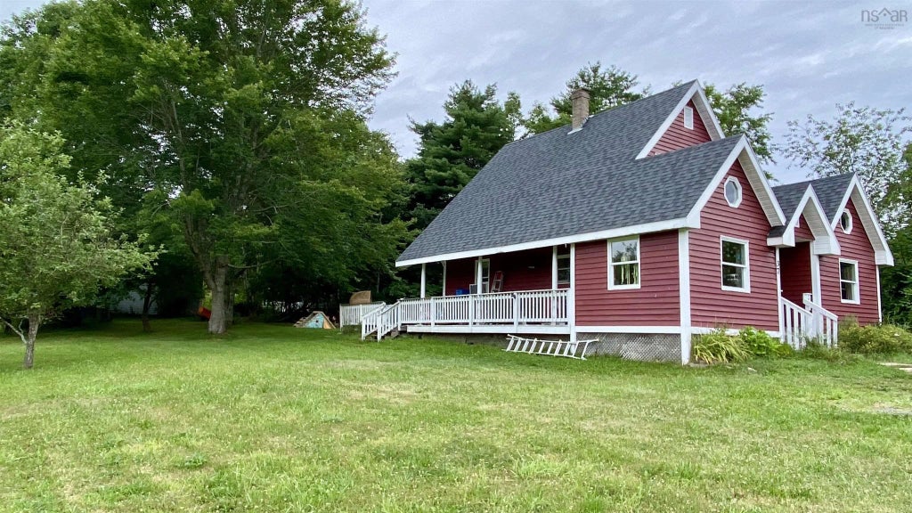 The flow of the home, along with coffered ceilings in the living room and kitchen, exposed beams and vaulted ceilings in the dining room and mudroom adds visual interest and makes this 1200 sq ft home feel more spacious. It’s a three bedroom one bath home with a covered veranda for enjoying the warm summer days in the shade, plus a large deck at the rear for bbq’ing and soaking up the sun. The perfect size for two, without being to large, a guest bedroom and the option for the third bedroom to be a home studio/office or comfortable for a family of three. The kitchen is central to the homes layout, a dining room with exposed vaulted ceiling and lots of natural light, a mud-room with plenty of closet space is located off the foyer, it can also be used for a small home office or reading nook and the large living room completes the main level. Upper level has three bedrooms and 4pc bath. Softwood floors in all primary rooms, bathroom has ceramic tile floor. Location, a ten minute walk to the Miller Point Peace Park, under a ten minute drive to Bridgewater for all amenities including the LCLC, curling club, arena, golf, marina, hospital, etc. and just over ten minutes to Lunenburg or 15 minutes to beaches.