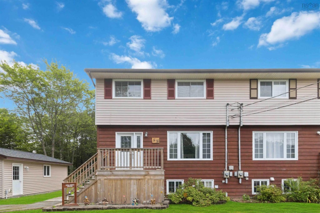 Welcome to 45 Kilgar Road in the Family Friendly community of Eastern Passage. This two story Semi Detached Home with Garage and Garden Shed resting on a private lot is waiting for you and Available for a quick close. This home is backed by a green belt and only steps away from the Shearwater Flyer Trail and only minutes Walking distance to Shearwater Air force Base. This Home has been meticulously maintained, This home is move in ready and waiting for you. As you approach this home you will be greeted by the long paved driveway and mature trees and landscaped lot. From the front door you will be greeted by a wide hallway leading to the Living room kitchen and dinning room with patio doors leading to your large 25x 13 deck with privacy wall and Gazebo overlooking your private backyard .The second level featuring 3 beds and Main Bath. The Basement level consists of Laundry room ,1/2 bath and a large Family room which can be accessed from the side door .This home has many upgrades and improvements ,It is close to all amenities including Restaurants and the popular Fisherman's cove.