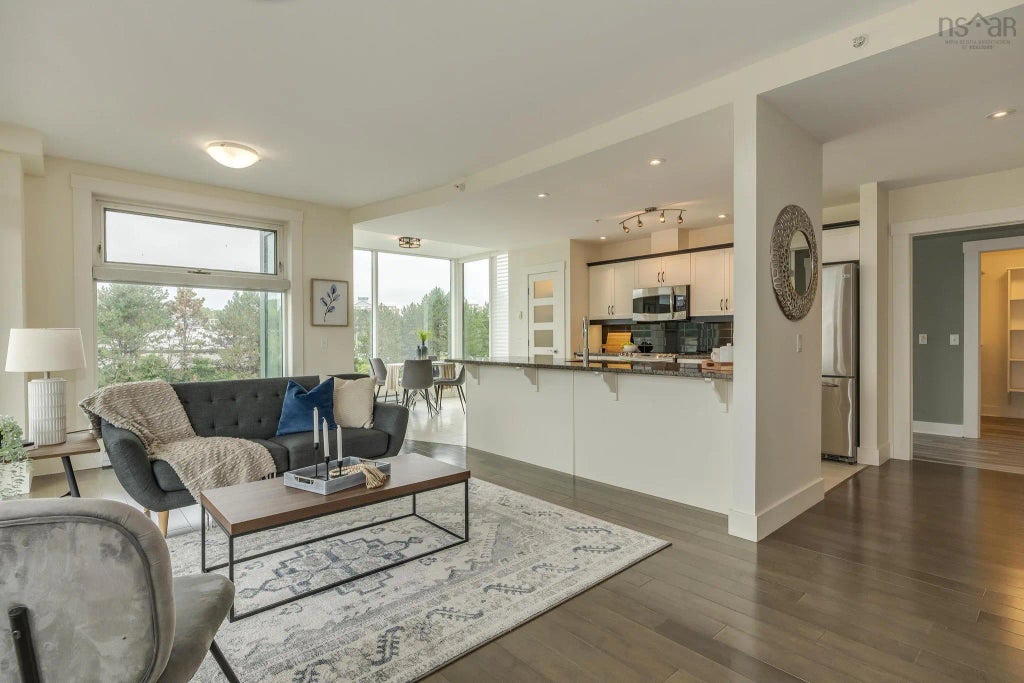 Welcome to Suite 307 at The Dockside, located at 220 Waterfront Dr. This light-filled condo, just a short stroll away from the future Bedford Mill Cove ferry terminal, offers a blend of comfort and elegance. The 2-bed + den, 2-bath unit boasts an open concept layout flooded with natural light from floor-to-ceiling windows, seamlessly integrating living and dining spaces with solarium, perfect for entertaining. The kitchen features stainless steel appliances, granite countertops, and ample cabinetry. The primary bedroom includes a walk-in closet and luxurious ensuite with a deep soaker tub, while the second bedroom offers versatility as a guest room or home office. Relax on the private balcony overlooking Moirs Pond, enjoy amenities like the fitness center and heated salt-water pool, and appreciate the convenience of a live-in superintendent. With high-end finishes and year-round comfort provided by the in-unit ductless heat pump system, this unit embodies waterfront living at its finest. Don't miss the chance to call Suite 307 at The Dockside your new home.