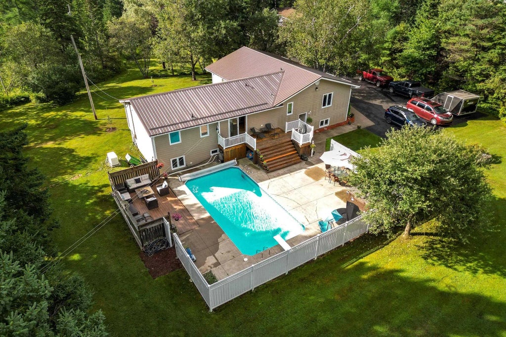 Expansive 5-Bedroom Home on 3.3 Acres of Secluded Paradise! Discover this stunning 5-bedroom, 3.5-bathroom residence, perfectly set on 3.3 acres of private land. With an impressive 4,376 square feet of meticulously maintained living space, this home exudes pride of ownership. The spacious living room, featuring vaulted ceilings and large windows, floods the space with natural light, creating a warm and inviting atmosphere. One of the standout features of this home is the expansive outdoor area, including a concrete patio and elevated wood decks that surround a 32’ x 16’ heated pool—ideal for entertaining guests. For added durability and convenience, the house is equipped with Hardie board siding, a steel roof installed in 2022, a new whole-home Generac generator, an ultraviolet light system for water purification, recently installed pool heater, and an annually sealed paved driveway. Additional highlights include a massive 24’ x 20’ shed, providing ample storage and workspace for yard maintenance. The 56’ x 24’ garage, with its own 100-amp electric service, dual overhead doors, and steel siding, is perfect for an automotive workshop or additional storage. Don't miss the opportunity to own this exceptional property. Schedule your viewing today!