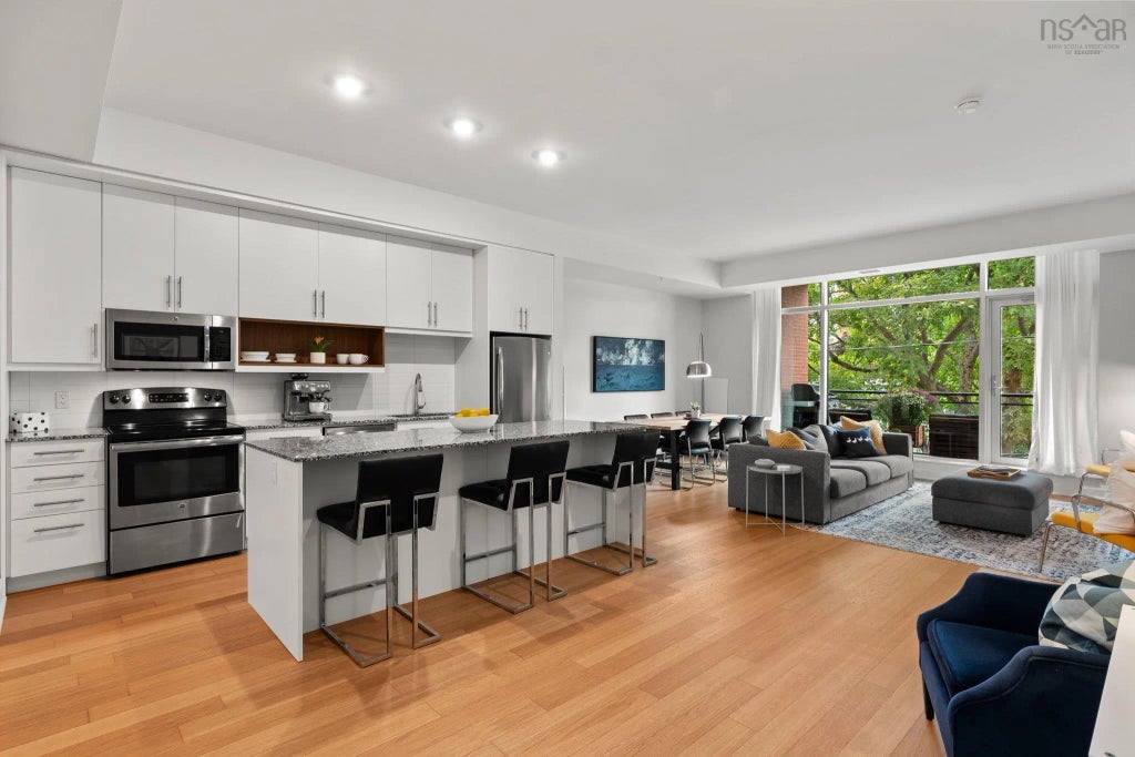 The perfect opportunity to enjoy modern condo living at The Avery, where the quintessential Downtown Dartmouth experience awaits! This 2 bedroom unit is located on the second level overlooking the leafy treetops of North St. and boasts larger than average spaces with thoughtful touches throughout. The floor to ceiling windows and 10’ ceilings are on full display the moment you enter into the foyer, and the living / kitchen / dining space combines to create a flexible “great room” that lends itself to multiple configurations. Chef’s will appreciate the functional kitchen with full island and loads of storage, and off the main living area is a clever office nook with built-in cabinetry and desk, as well as an enclosed laundry room with space for storing life’s essentials. The oversized primary bedroom with walk-in closet is a rare find for condominiums and is nicely tucked away off a side hall that affords handy access to the large full bathroom with dual vanities. The living space extends outdoors to your private terrace, positioned for excellent privacy and with ample space for relaxing - and BBQs are permitted! Central A/C and Heat are included in the affordable condo fees, and other building amenities include a stunning rooftop terrace with BBQ facilities, gym, function room, and bike storage. This unit includes a secure, private, underground heated parking space and storage unit. A quick walk through the charming streets of Downtown Dartmouth takes you to some of the best cafes, restaurants, and local shopping to be found. View the virtual tour for full details.