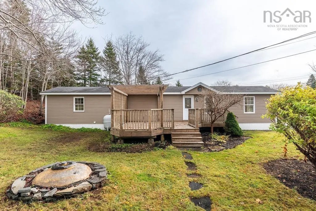 Discover this charming, fully renovated mobile home that exudes curb appeal with a welcoming pergola over a new deck, a wood fence, and flagstone walkways. Thoughtfully updated over the years, the home has a refreshed, inviting feel. Step into the eat-in kitchen, featuring warm oak cabinets, updated countertops, sleek stainless steel appliances, and contemporary flooring. The open-concept living room is airy and inviting, with laminate flooring and cathedral ceilings—perfect for relaxing or entertaining. The spacious primary bedroom comfortably fits a queen bed with room for a dressing area, and a convenient pocket door provides direct access to the main bathroom. A separate laundry area includes a back door leading to a deck, ideal for drying clothes on sunny days. A second bedroom offers flexibility, making a great space for a single bed, bunk beds, or a home office. A detached single garage provides ample room for parking and a dedicated workspace, while two additional sheds on the property offer plenty of storage for tools and toys. Located close to Lawrencetown and Conrad Beach, c in with nearby walking trails and only 10 minutes to the city, this move-in-ready home combines modern updates with practical features, creating a cozy and functional living space.