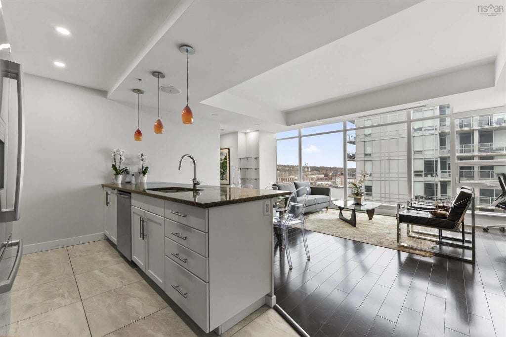Stunning water views! Welcome to the Keelson, one of the most sought after condo buildings in Downtown Dartmouth for its location and amenities. This particular floor plan is especially desirable with views of both the Harbour and Dartmouth Cove, while being set back from the road with a private balcony. The unit is separated into two wings. The first is the primary bedroom with ensuite. At the other end of the condo is the second bedroom, and second full bathroom. Perfect for functionality and hosting. The main living area is open concept with floor to ceiling glass to appreciate the views, but also with custom motorized Hunter Douglas blinds when desired. The kitchen features granite counters, upgraded cabinets, and a gas stove. A Napoleon gas fireplace in the living room and a Napoleon electric fireplace in the primary bedroom. Numerous upgrades and customizations including additional storage. All this, plus underground parking, heat and AC included in condo fees, a well appointed gym, common room, and walking distance to shops, restaurants, parks, and the Ferry.