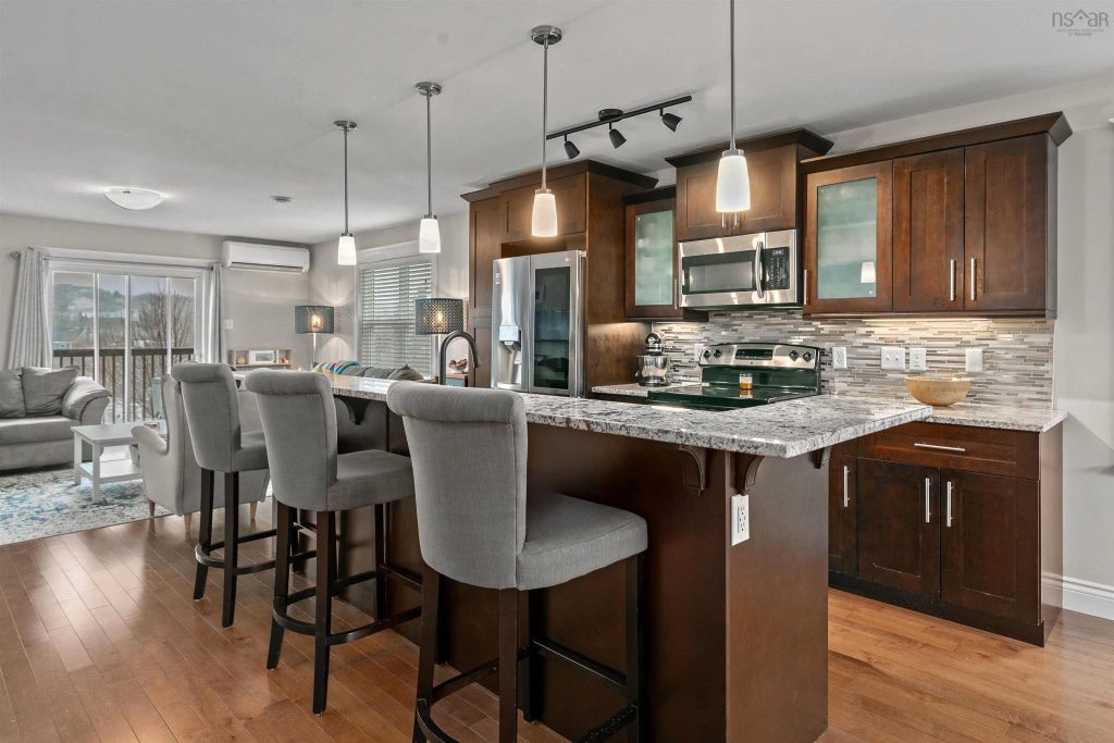Welcome to 27 Halef Court, located on a quiet cul-de-sac in the conveniently located community of Armdale. The main floor of this stunning semi-detached home consists of a spacious cook’s kitchen with oversized island and beautiful granite countertops. It is open to an inviting living room leading you to a deck overlooking a deep, fenced back yard with storage shed. There is also a charming dining nook and a 2 piece powder room. The second floor boasts 3 well sized bedrooms including a primary bedroom with ensuite and upstairs laundry. The lower level is bright and features a family room with propane fireplace and a walk out to a ground level deck - perfect for entertaining. Additional spaces include a 3 piece bath and a bonus room that can be used as an office, storage or even an extra bedroom. There is also an open-concept flex space which is currently set up as an office for two. The heating system is all electric, including a ductless heat pump. The solar panels will pay you to heat your home for years to come!