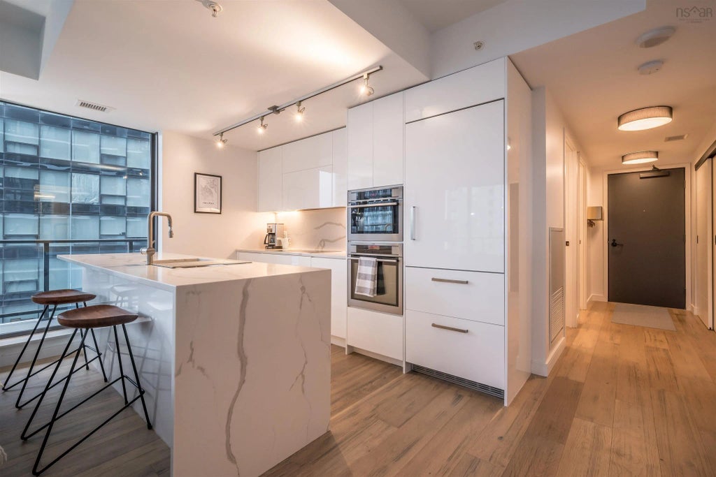 THE ROY is Halifax's most luxurious condo complex and with Unit 1110 comes one of the best deeded parking spaces in the building (YES, parking is included in the purchase price)! This 2 BED + DEN and 2 FULL BATHROOM corner unit has 1000 sq. ft. of indoor living space and a 335 sq. ft. wrap-around balcony that is accessible from the living room and both bedrooms. The sleek kitchen features state of the art appliances, quartz countertops and a large island that can comfortably seat four people. With floor-to-ceiling windows throughout, you can enjoy an abundance of natural light from every room. This unit is complete with a walk-in closet and ensuite in the primary bedroom, in-suite laundry, electric in-floor heat in both bathrooms and a den that is an excellent space for a designated office or play area for kids! An assigned humidity controlled storage unit is available for your extra items. This secure 22 storey building is like no other- with 10,000 sq. ft. of world class, unmatched amenities including a movie theatre, a yoga studio, a luxe fully-equipped gym, an indoor heated pool, a spacious sauna, steam rooms, a conference room, rooftop terrace with outdoor fireplaces, a kitchen and dining area for entertaining a larger crowd and a relaxing library with an indoor fireplace. Can we also boast about the fact that a car elevator takes you to your parking level? Don't forget the incredible 24 hour concierge team! Located in a vibrant neighbourhood- steps from the Halifax waterfront where you can enjoy all of the city's best restaurants, cafes, shopping and entertainment!
