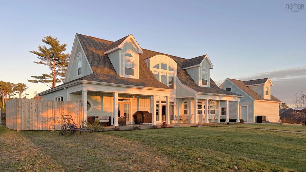 Showcasing a six-year-old home with a captivating hilltop view of Chester Basin, located on 1.56 acres with 156 feet of oceanfront. This Chester Builders custom design/build, 3-bedroom, 2 full bathroom and 2 half bathroom layout has oodles of room (2384 square feet of living space plus another 600 square foot two bay garage). Sunsets and evening soirees were in mind with the south and west facing composite decks and landscaped stone fire pit. Enjoy the private beach down by your private wharf/floating docks. From the end of the wharf, you can see right down the bay to the open ocean. Entering this home, the soaring vaulted ceiling accentuates the panoramic view and sunlight filtering through the expansive windows. A propane fireplace in the living room, and ducted heating and cooling will keep you comfortable. The reclaimed wood for the Kitchen Island, beam and mantelpiece are just some of the featured material details. An open concept dining/kitchen area with stainless steel appliances and a farm style sink will make entertaining a joy. The primary suite with a five-piece ensuite and walk in closet is conveniently located on the main level. An additional powder room, laundry facility and utility room round off the main level. Several second-floor architectural features make this home really shine; an interior hallway overlooking the main level and a south facing bedroom balcony; perfect for a morning coffee. Two bedrooms situated end to end, and a four-piece bathroom ensure privacy and comfort. That’s not all though! The newly constructed detached two bay heated garage features a 300 square foot loft and a two-piece bathroom on the ground floor. It is wired with an EV charger. Also included is a whole house Generac generator, irrigation system that uses rainwater collection, deep water anchorage mooring just off the wharf, electrical line running to the wharf and second lower parking pad for a boat.