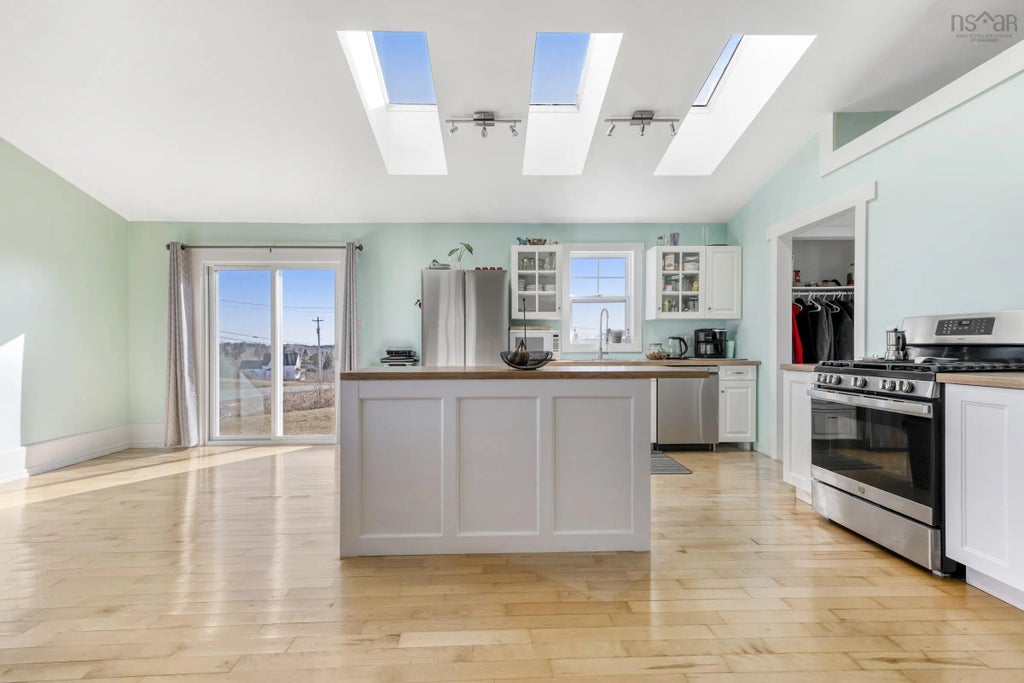Ocean-view 2-bedroom, 2-bath home in the coastal community of West Berlin on Nova Scotia’s South Shore. This elevated lot of over two acres offers views of Blueberry Bay, and a large private, nicely treed back yard. The thoughtfully created contemporary Great Room with cathedral ceiling, skylights, large windows and patio door, provides bright and airy open-concept one-level living that will make for seamless entertaining inside and out. Modern kitchen features a large island and propane stove. Primary bedroom’s walk-in closet is plumbed for potential addition of an en suite. Second bedroom, Laundry Room, one full and one half bath complete the main floor. Efficient and low-maintenance electric baseboard heat combines with a Fujitsu ductless heat pump that also provides cooling during summer. This property’s location offers lots of options for a new owner. A 16 x 14 storage shed could be converted into use as a Bunkie, and you are within walking distance of a white sand beach...or take your pick of several large beaches within a short drive. Significant recent updates include septic system, drilled well, heat pump and back deck. Single detached garage and two driveways for lots of parking / extra storage. About 10 minutes to the amenities of Town of Liverpool, 25 minutes to Bridgewater and 90 minutes to Halifax and international airport.